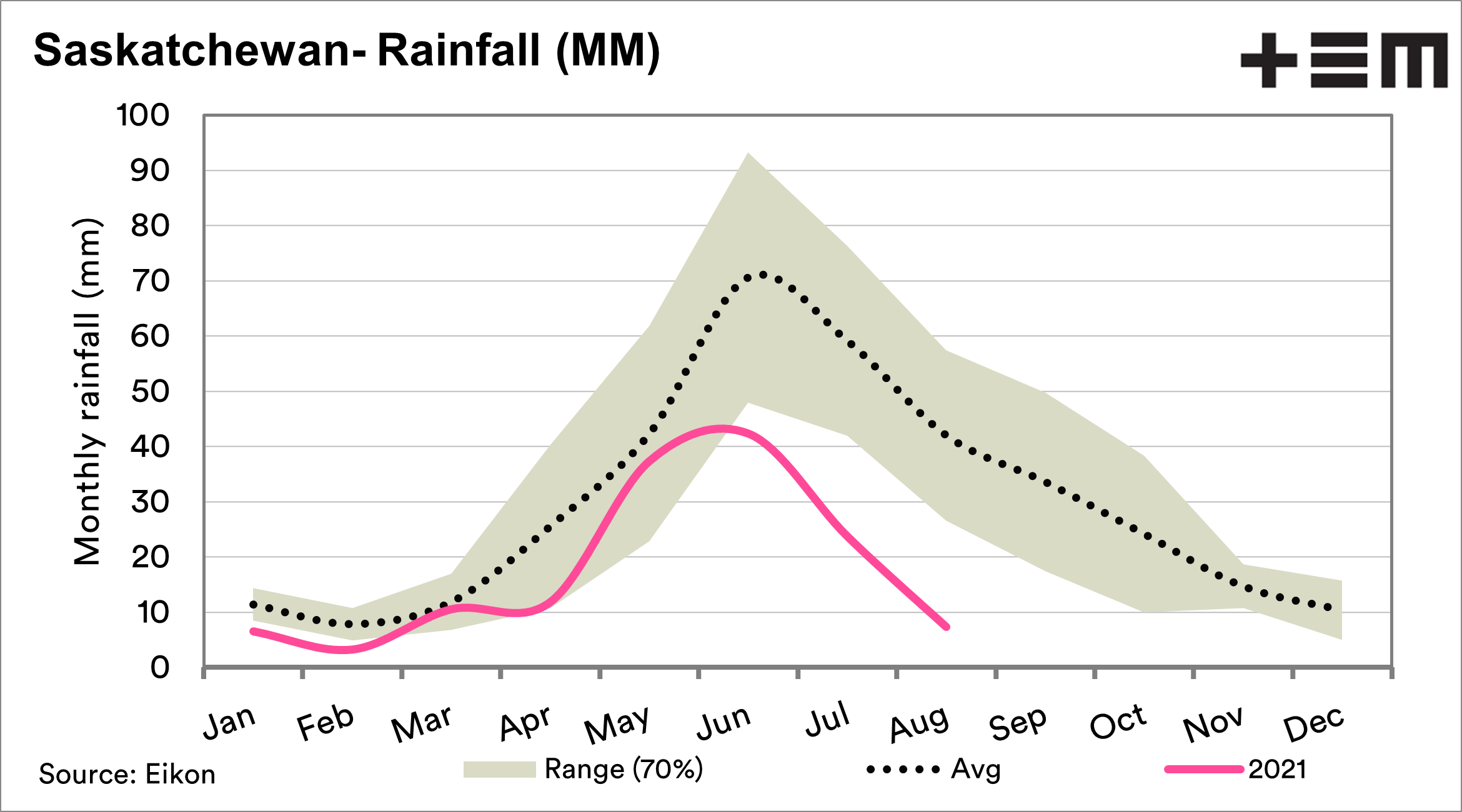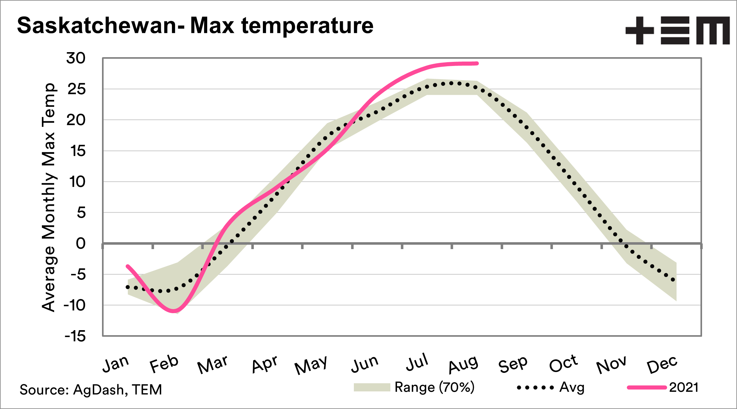 Saskatchewan is the most important province in terms of grain production in Canada. This region, among others, has suffered through a lack of moisture this season and high temperatures. The max temperatures have been significantly higher than usual.