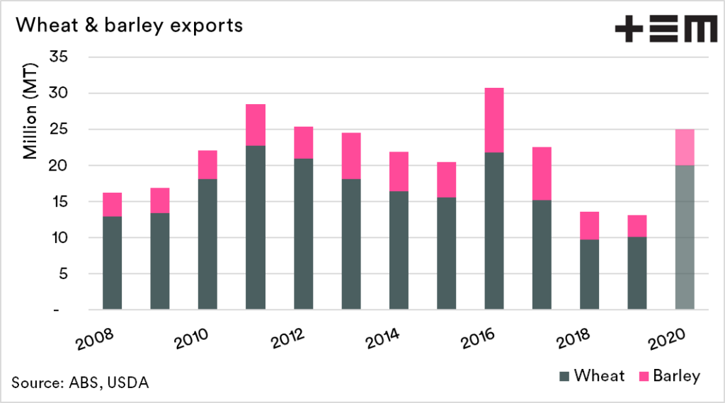 - USDA forecasts are for 5mmt of barley exports, and 20mmt of wheat.