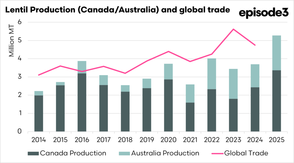 Record production in Australia and Canada in 2025 has already shown how quickly the lentil market can move from tight to oversupplied. History suggests that once this shift occurs, prices adjust decisively rather than gradually.