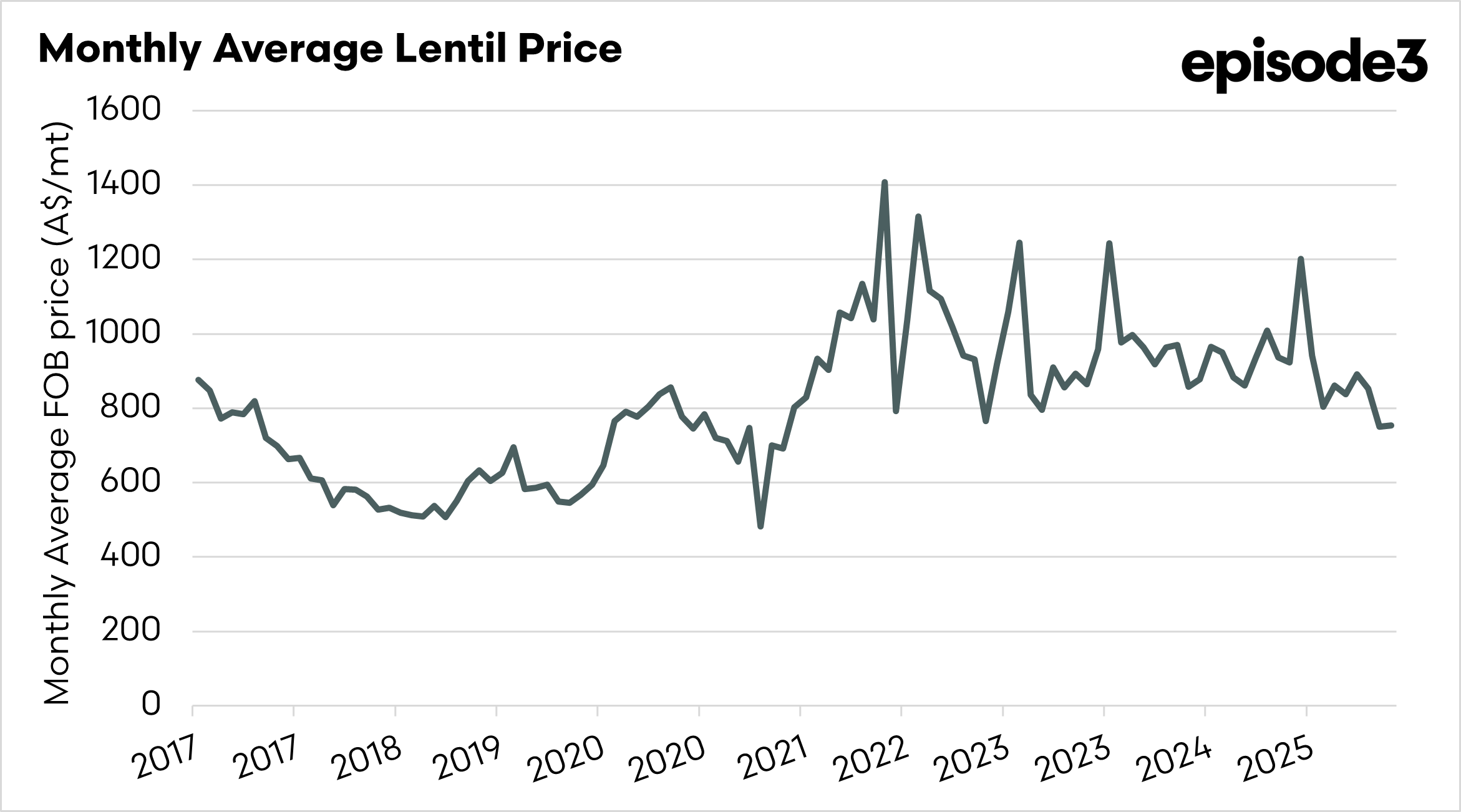 Australian lentil prices reflect this sensitivity very clearly. The monthly FOB data shows that lentil prices have been highly variable, moving sharply in response to changes in global supply.