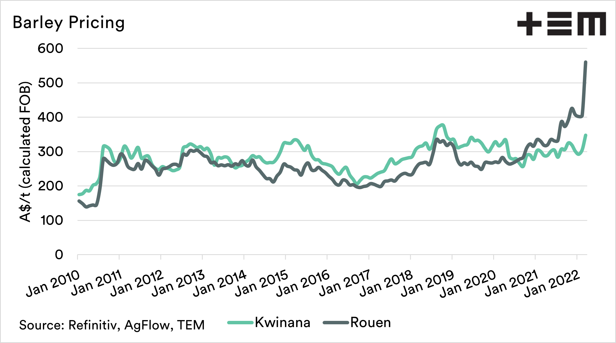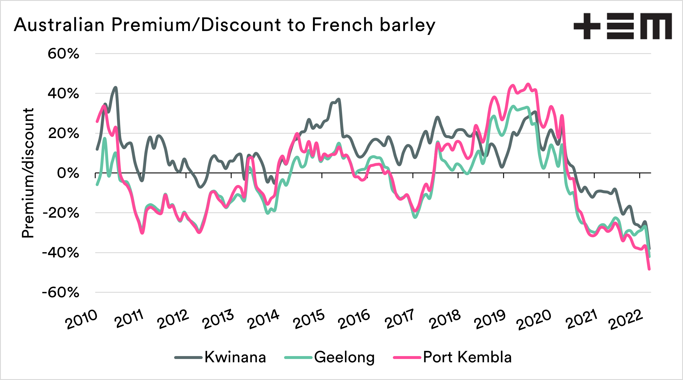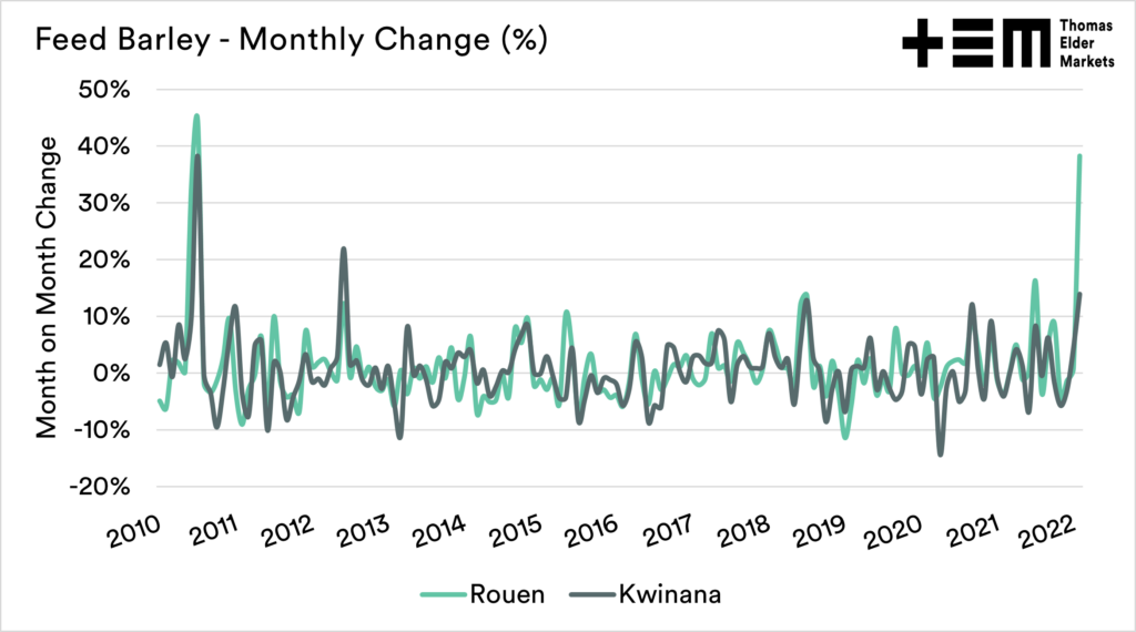 14% is clearly a fantastic return month on month, but as we have seen with many of our grains, our pace is not keeping up with the rest of the world. This has meant that our pricing levels have fallen to the largest discount to French barley that Australia has experienced since at least 2010.