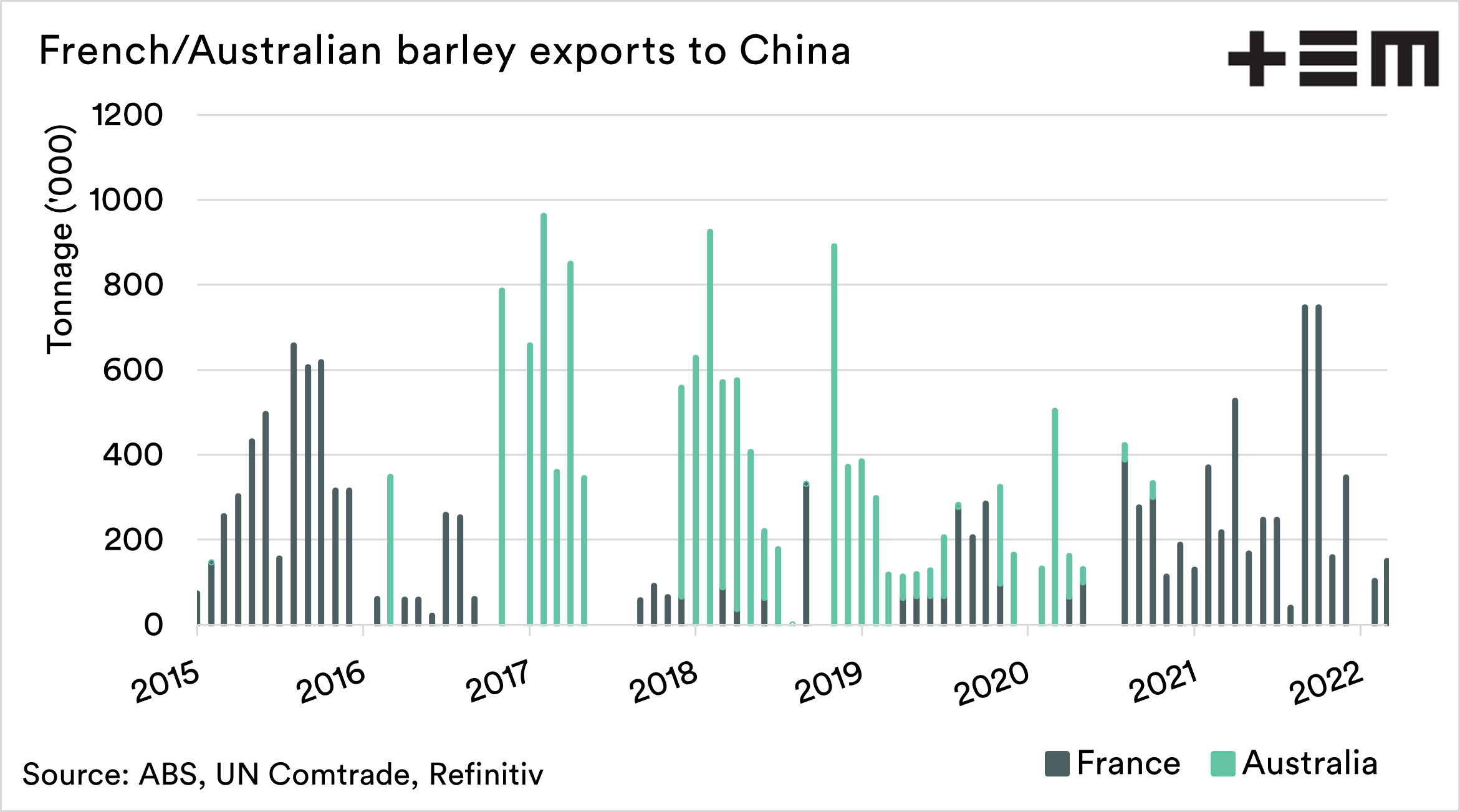 - Australian feed barley is at the largest discount to French since at least 2010.