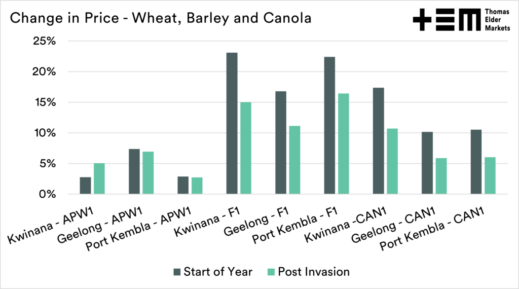 First, how have prices compared between grains in Australia? The chart below shows the change in price between two points and present. It’s important to define these two pricing points, one was before a Russian invasion was considered likely, and one since the invasion commenced.