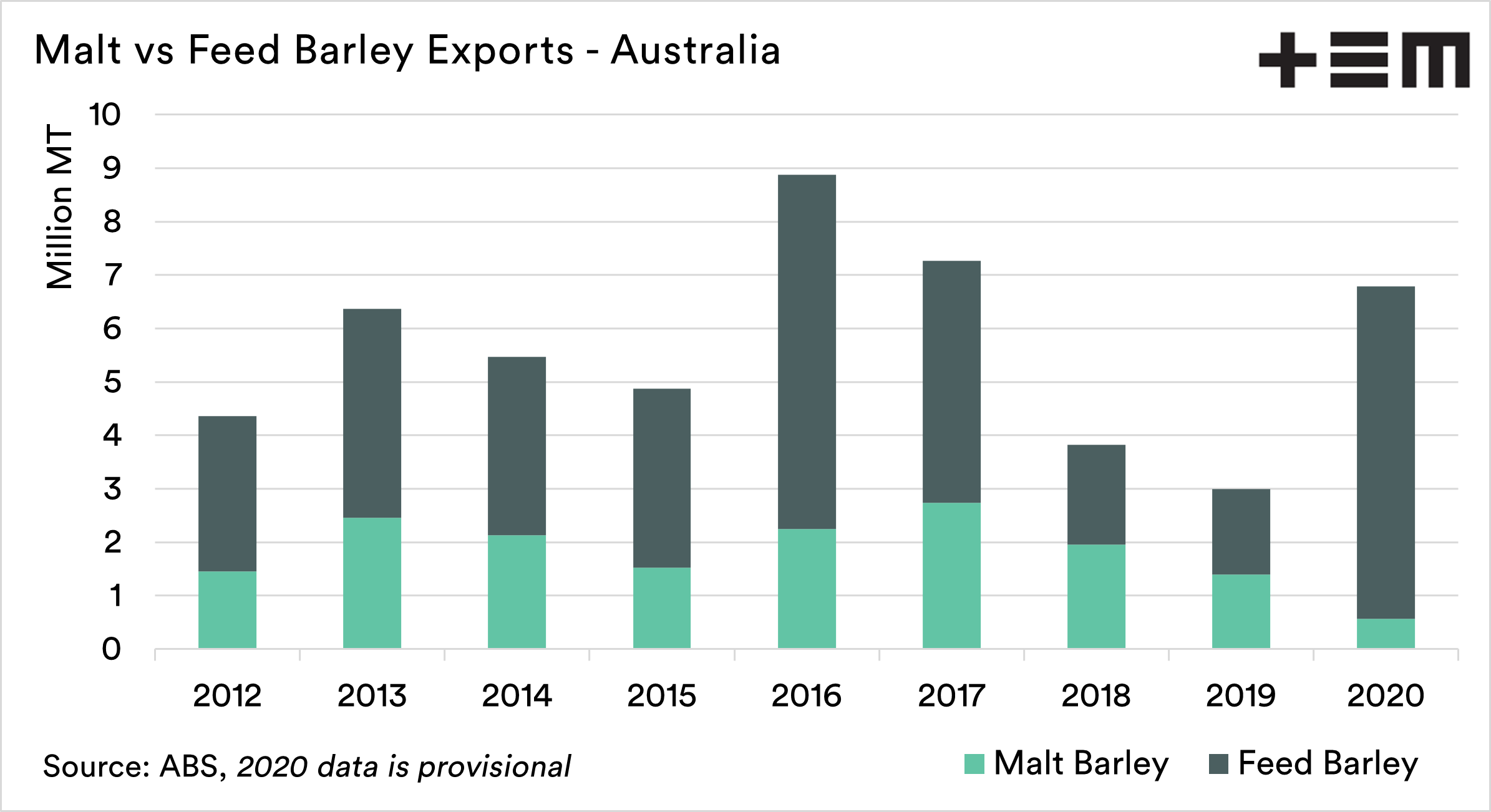 The volume of barley for malting leaving Australia between 2012-2019 was on average 1.9mmt, with a high of 2.7mmt in 2017 and a low of 1.4 in 2019. The 2020 data is still provisional, but at present, it is looking like a low percentage was exported as malt.