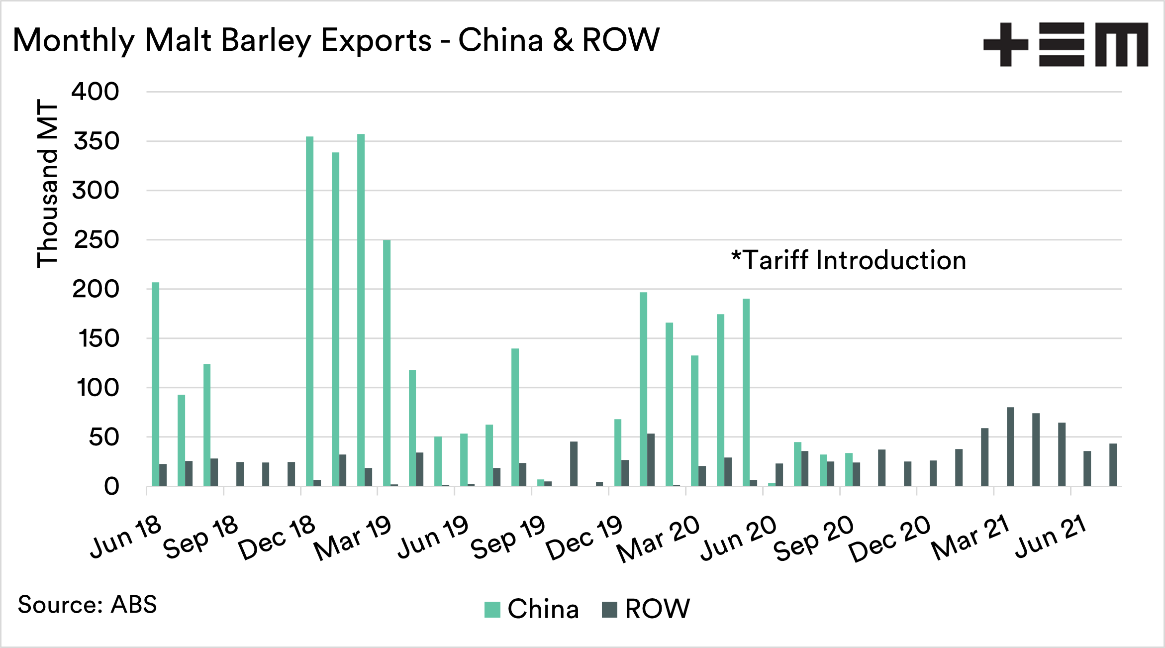 - Malt barley exports have not recovered since the tariff introduction.