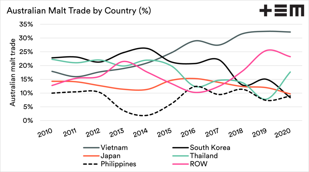 The chart below shows the composition of the malt barley trade, and as we can see, the majority of malt has been headed to China. Whilst 2020 annual data is still provisional, there has been a huge fall in malt exports.