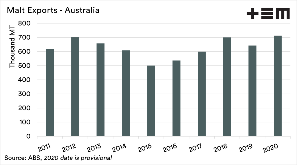 The export of malt between 2011 and 2020 has been between 500 and 712kmt. The overall malt capacity in Australia is approximately 1mmt.