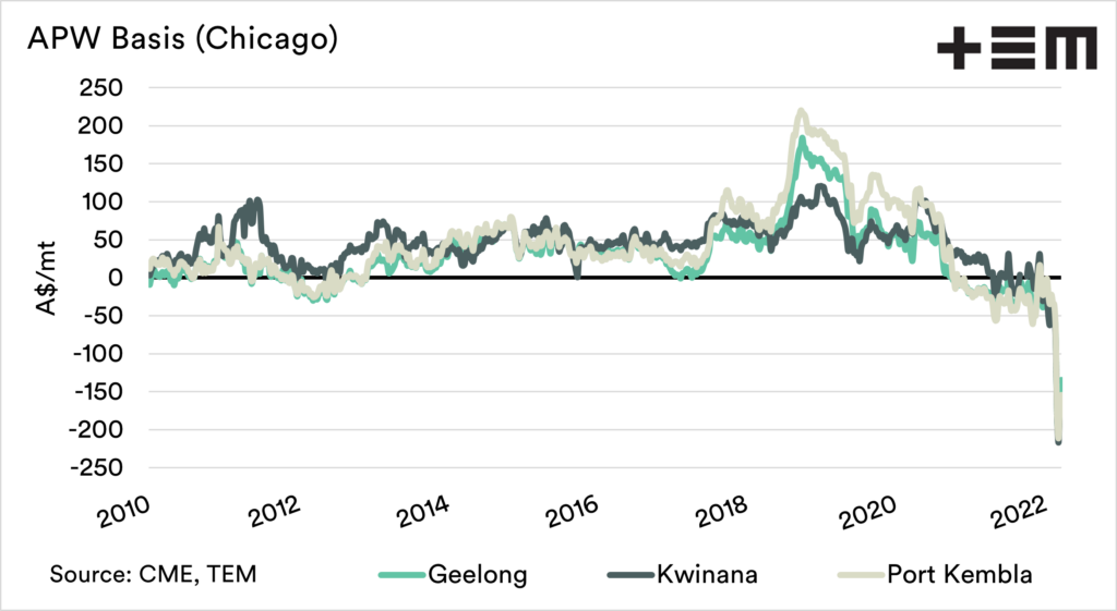 So while it has improved, it has gone from a really really huge discount to what could be considered a really huge discount. Australian prices have typically traded at a strong premium over Chicago wheat futures like most port zones in Australia. So whilst improved for growers, it is hardly a great spread.