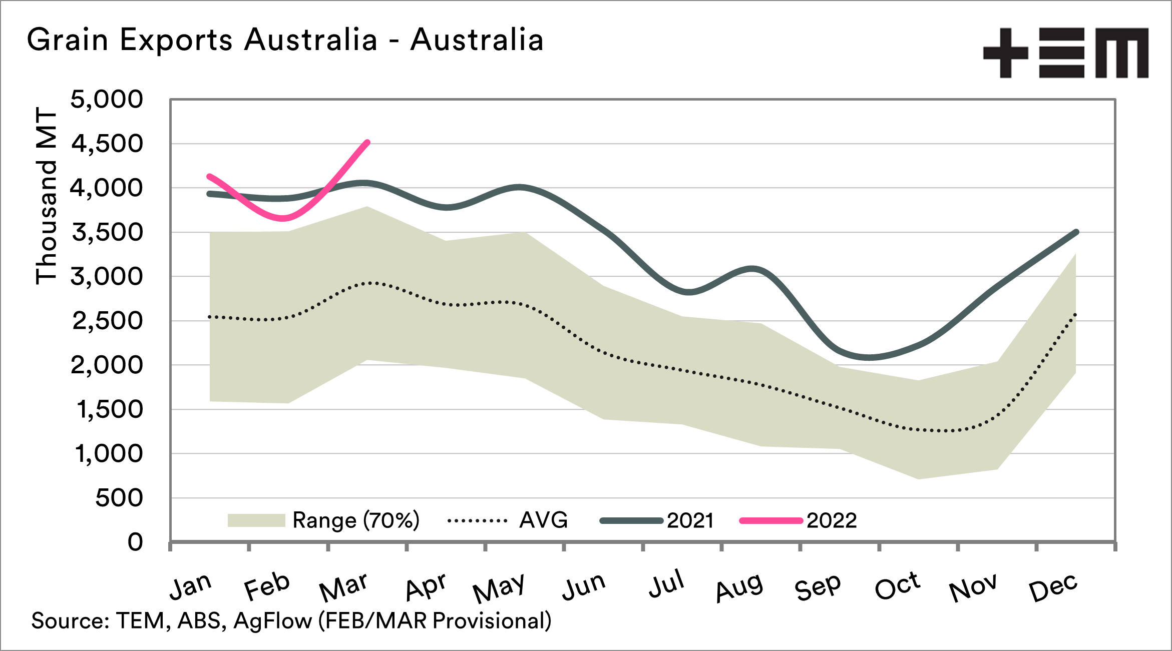 To get the most up to date data on exports, we use data from our partners at AgFlow, who have access to export volumes through their network of contacts. This allows us to update until the middle of March, instead of the ABS data which has January as the most up to date data point.