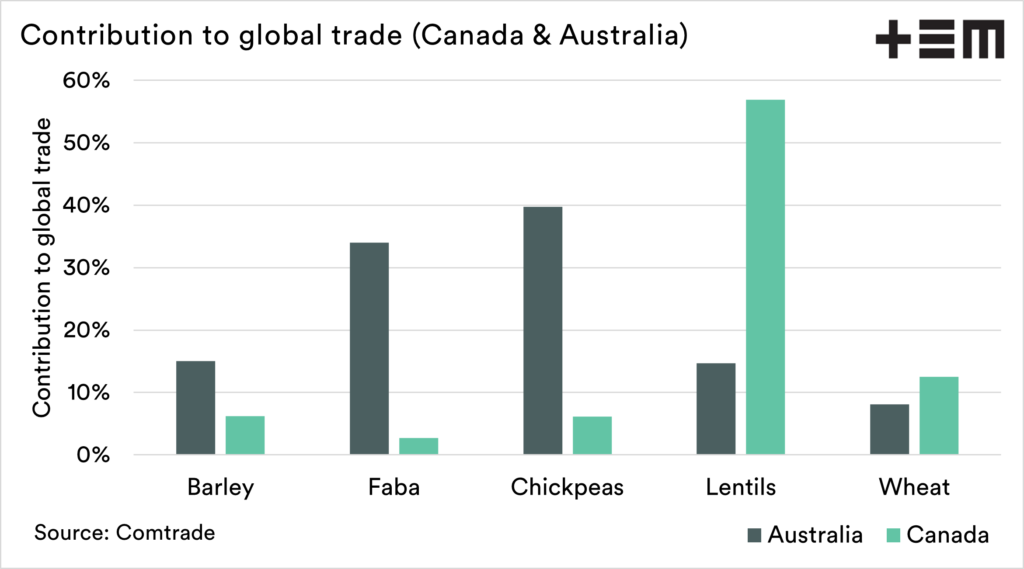 - They contribute 6% of barley, 3% of faba beans, 6% of chickpeas, 57% of lentils and 13% of wheat global trade.
