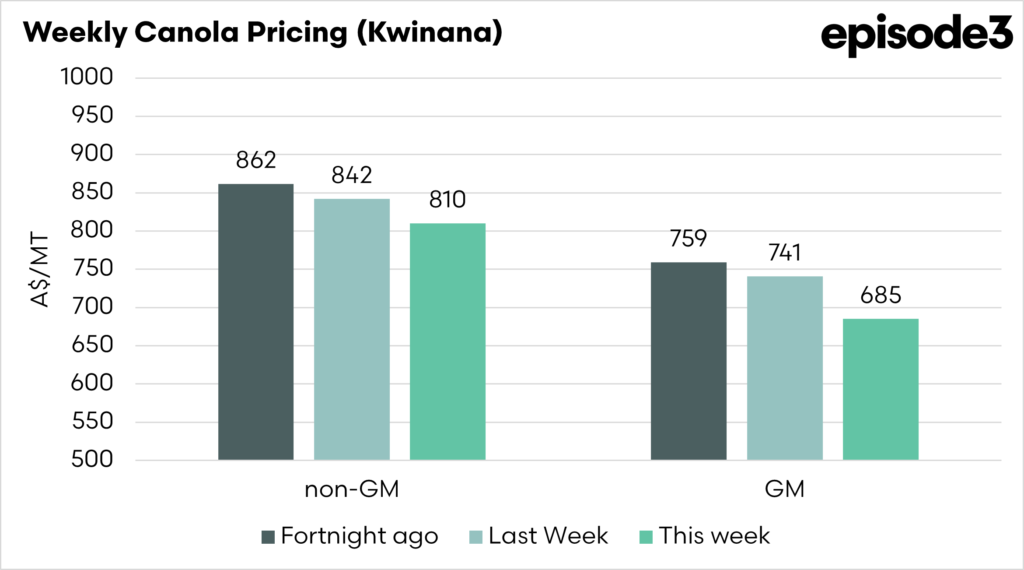 We are already seeing this in the movement in our canola pricing. The chart below shows the weekly average price for Canola in Kwinana. In a fortnight, non-GM canola has moved from A$862 to A$810, and gm from A$759 to A$685