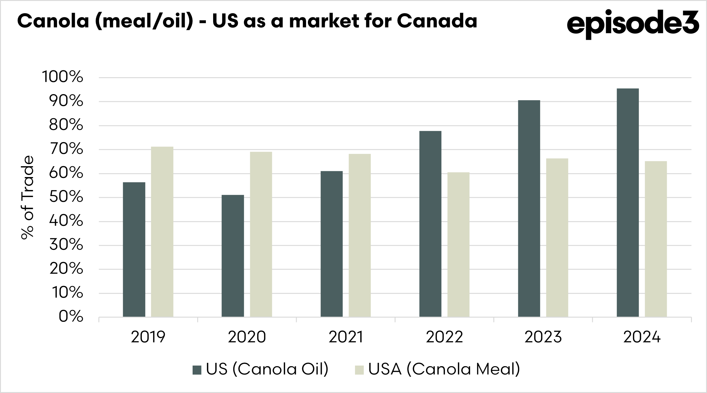 In recent years, more than 90% of all oil exports from Canada have been exported to the United States. Simultaneously, more than 60% of canola meal has made the same journey.