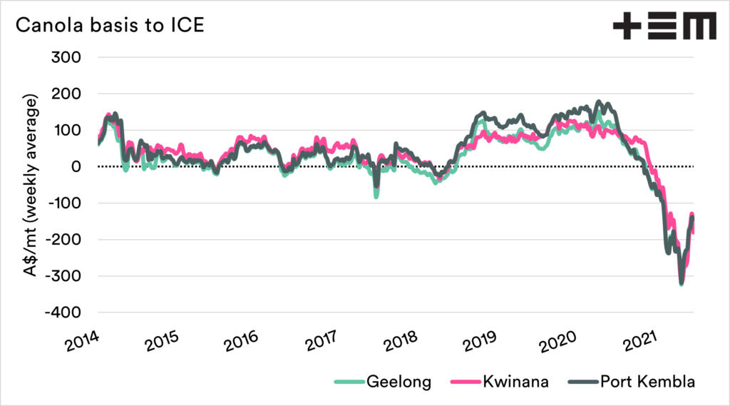 I was asked on Twitter the question, “When will WA canola hit A$900/mt” (see here). The current top bid for new crop canola is A$815/mt; this is a basis of -A$60. If basis was back to the average levels of +A$55, we would see a price of A$930. Should we be getting A$930?