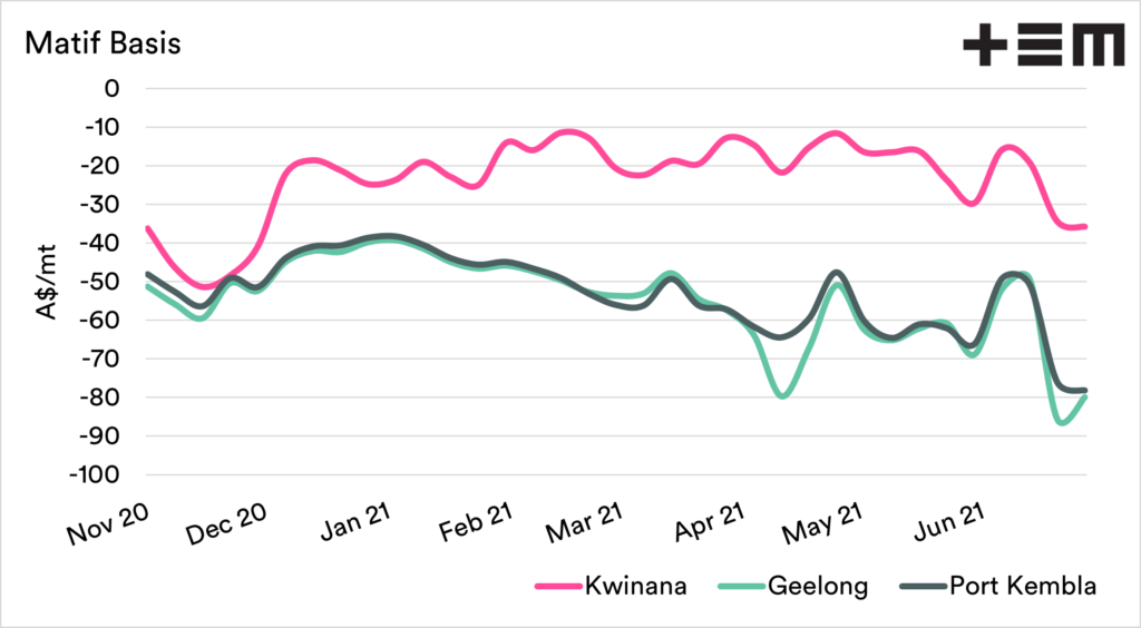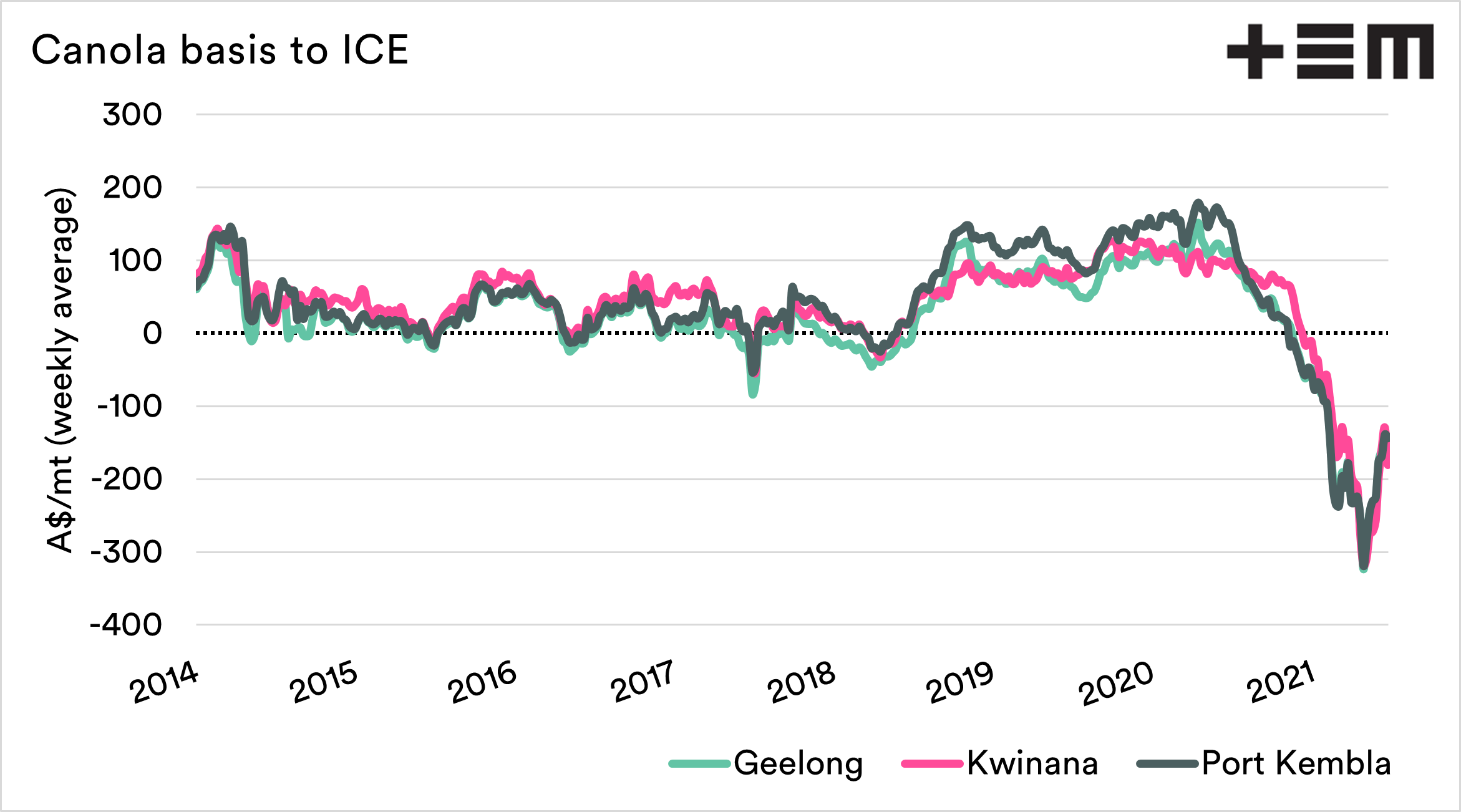 If we compare to Matif, which is French rapeseed the situation is closer. Our basis level between Kwinana and Matif has averaged -A$18. The current basis level is -A$30. This is substantially closer than the current ICE-Kwinana spread to the norm.