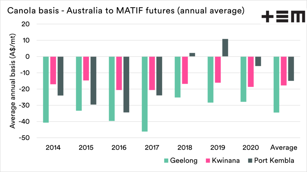Traditionally, Australian canola trades at a premium to Canadian canola. The chart below shows the average annual basis between spot Australian prices and ICE canola.