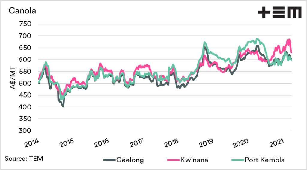 Wheat and barley prices around Australia have fallen considerably from the drought premiums on offer over the past couple of years. This is to be expected as we move from a deficit to surplus. However, canola has seemingly bucked that trend.
