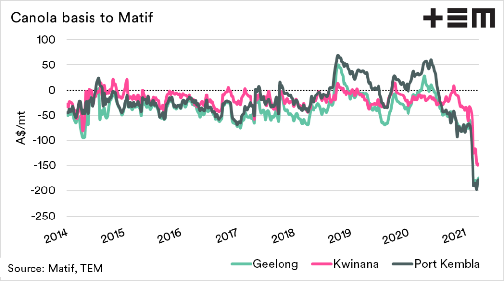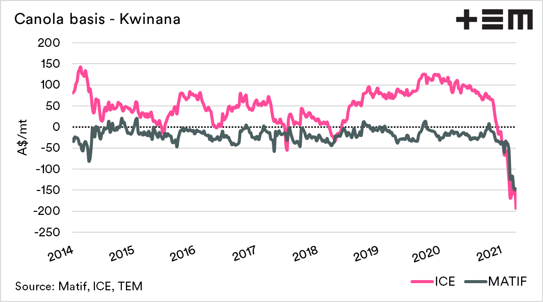 The basis level between Kwinana and ICE/Matif futures is shown in the chart below since 2014. Typically the pricing is at a premium versus ICE and at a discount to MATIF.