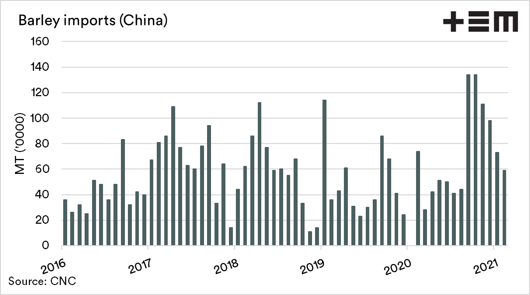 - Chinese imports of barley ramped up during the last quarter.