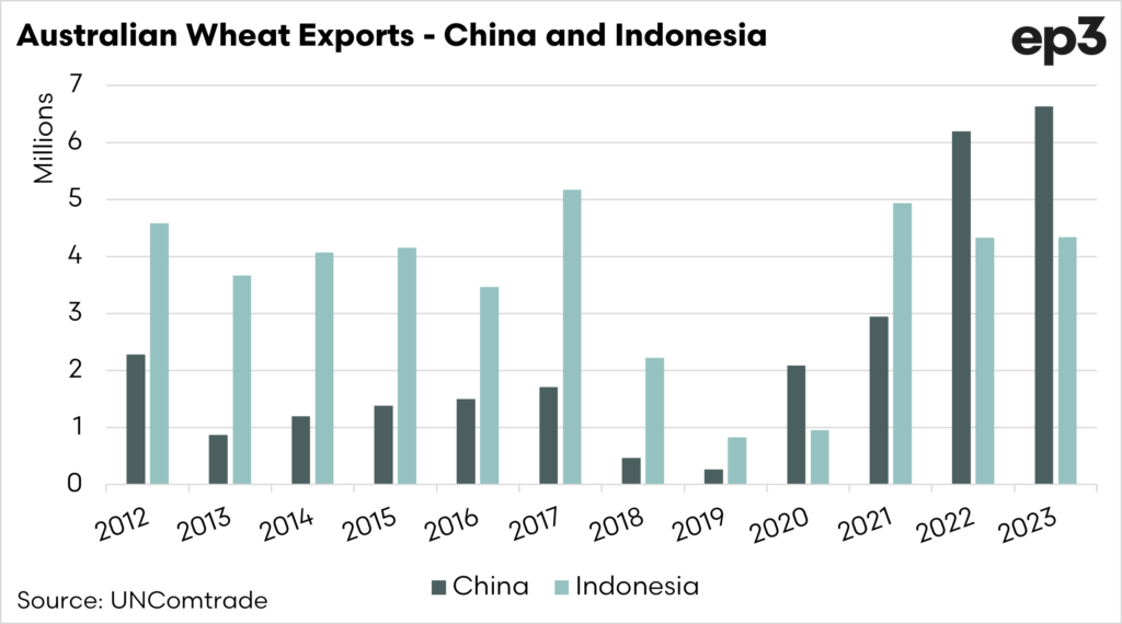 Traditionally, the biggest customer for Australian wheat has been Indonesia. However, recent years have seen China take over the mantle for wheat exports.