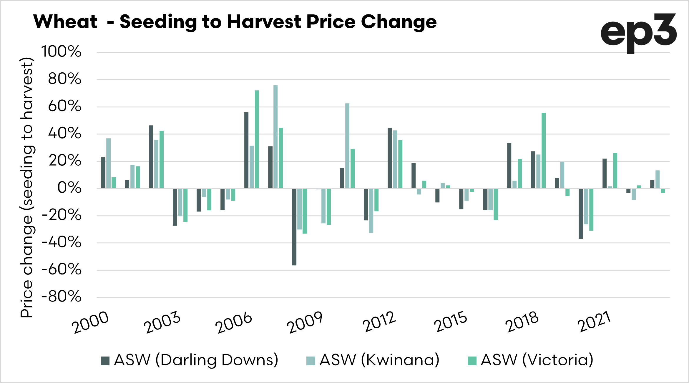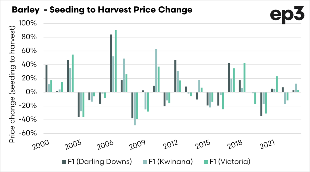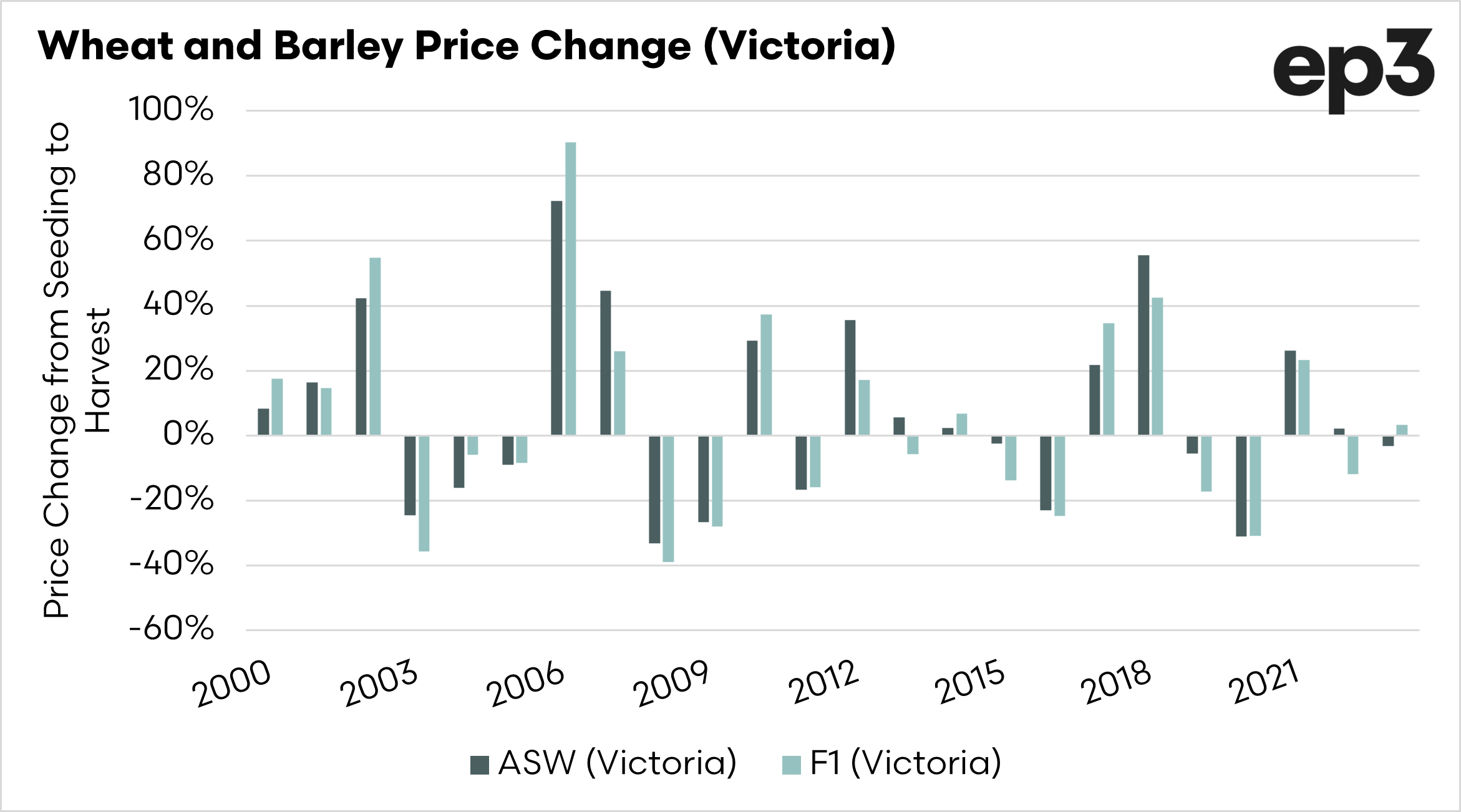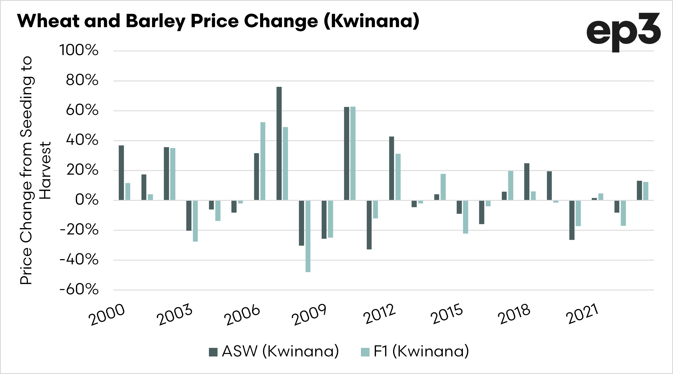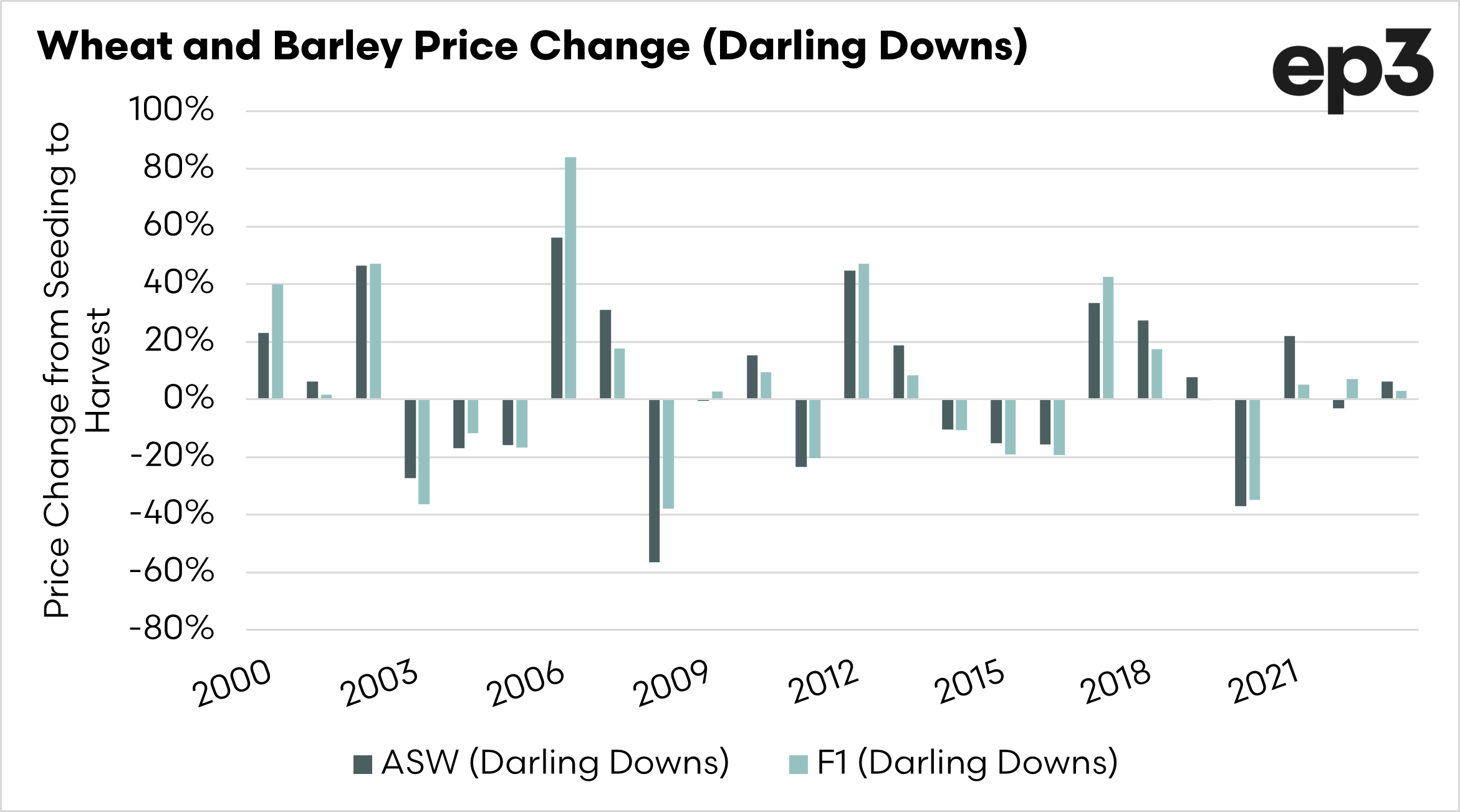 We can see the sheer range of pricing between the two periods. There is no real relationship or consistency. The price of grain can dramatically change in the months between seeding and harvest.