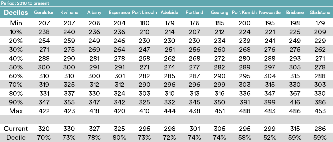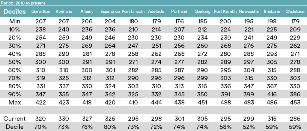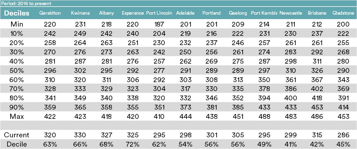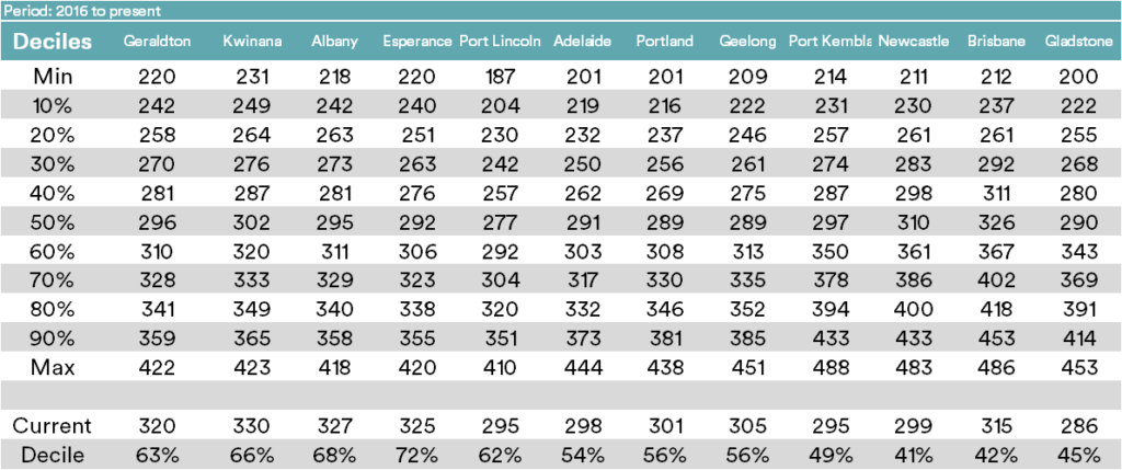 The tables below display the spot APW price for ports around Australia. Included are two timeframes of deciles, long term from 2010 & 2016 to present.