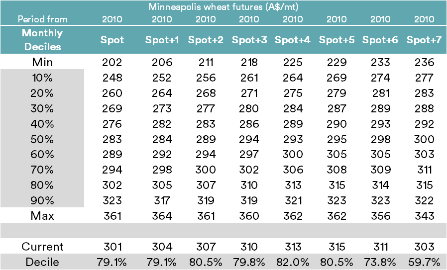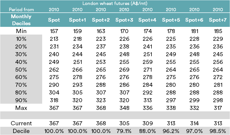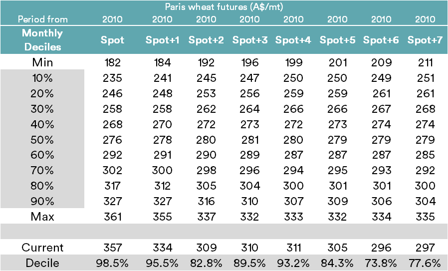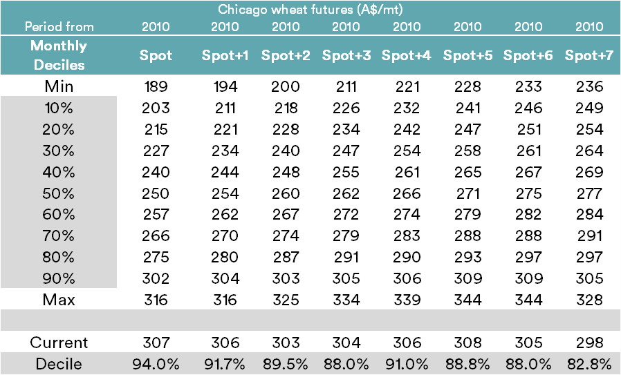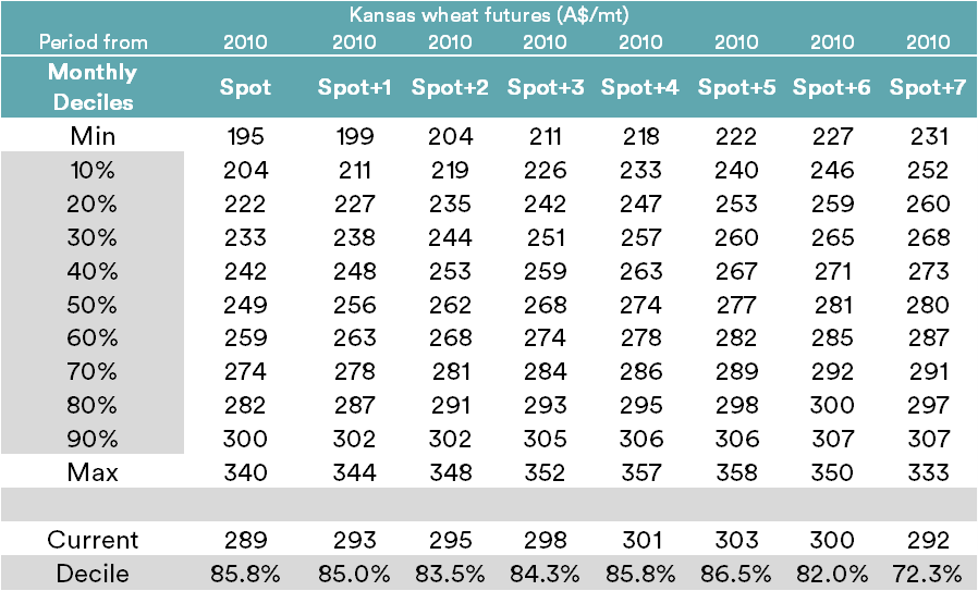 Decile tables for the monthly average price for various overseas futures values. These decile tables include the spot contract and the following 7 contracts. This gives an insight into the forward curve of the wheat markets.