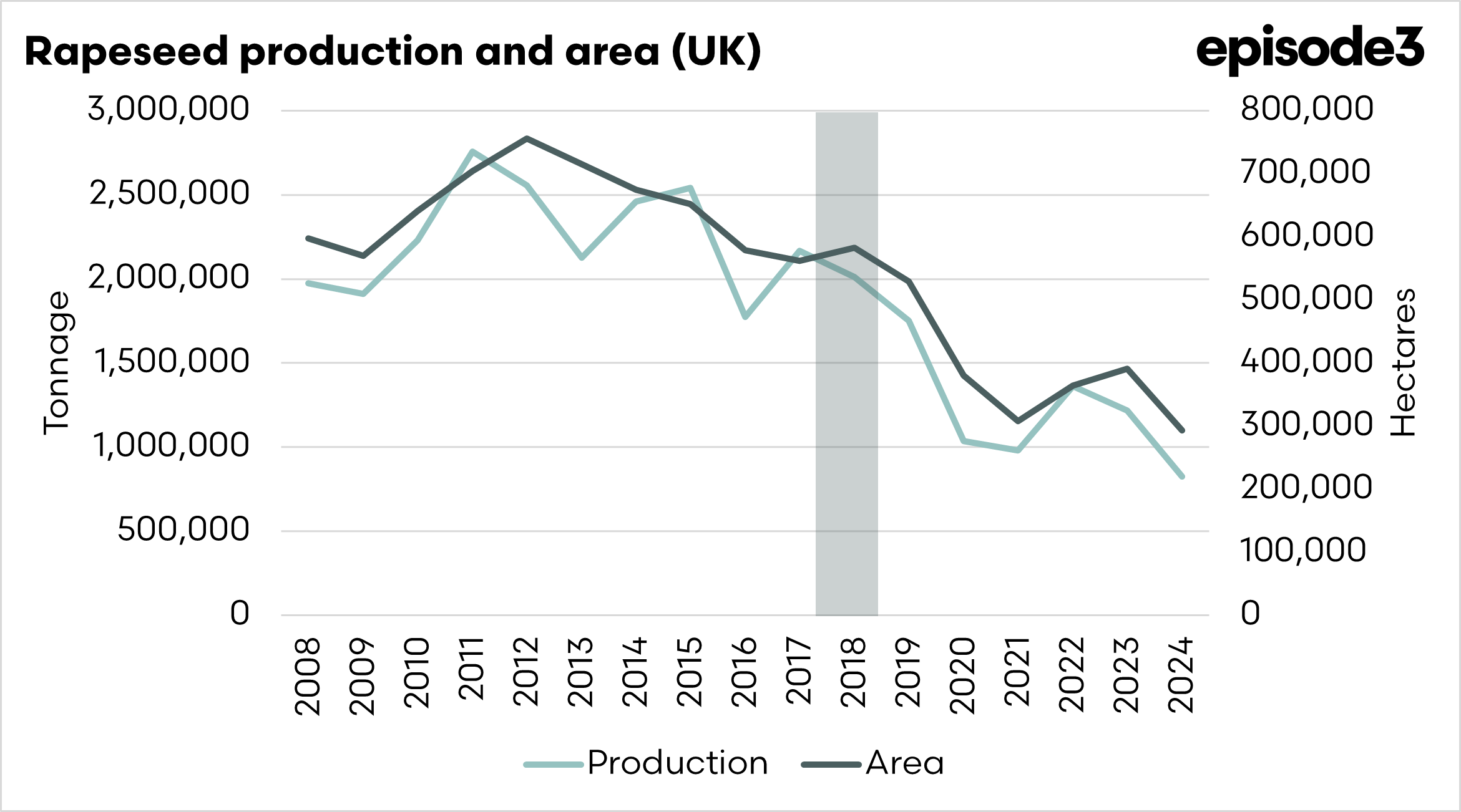 The result was that British farmers significantly reduced the area they planted with rapeseed, as they lacked confidence in alternative protection measures. In the five years to 2018, the UK planted an average of 634k hectares; in the five years post the ban, they planted 394k hectares. Production was 2.2mmt pre-ban and 1.2mmt post-ban.
