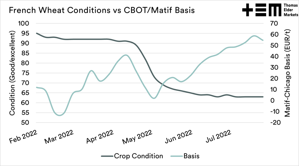 The EU drought isn’t having a huge impact on global wheat pricing. If we look at Matif and CBOT pricing in recent weeks, the pricing action has been relatively subdued and boring compared to recent months.