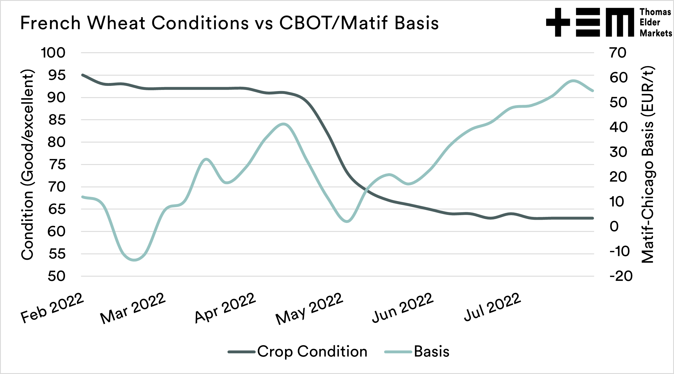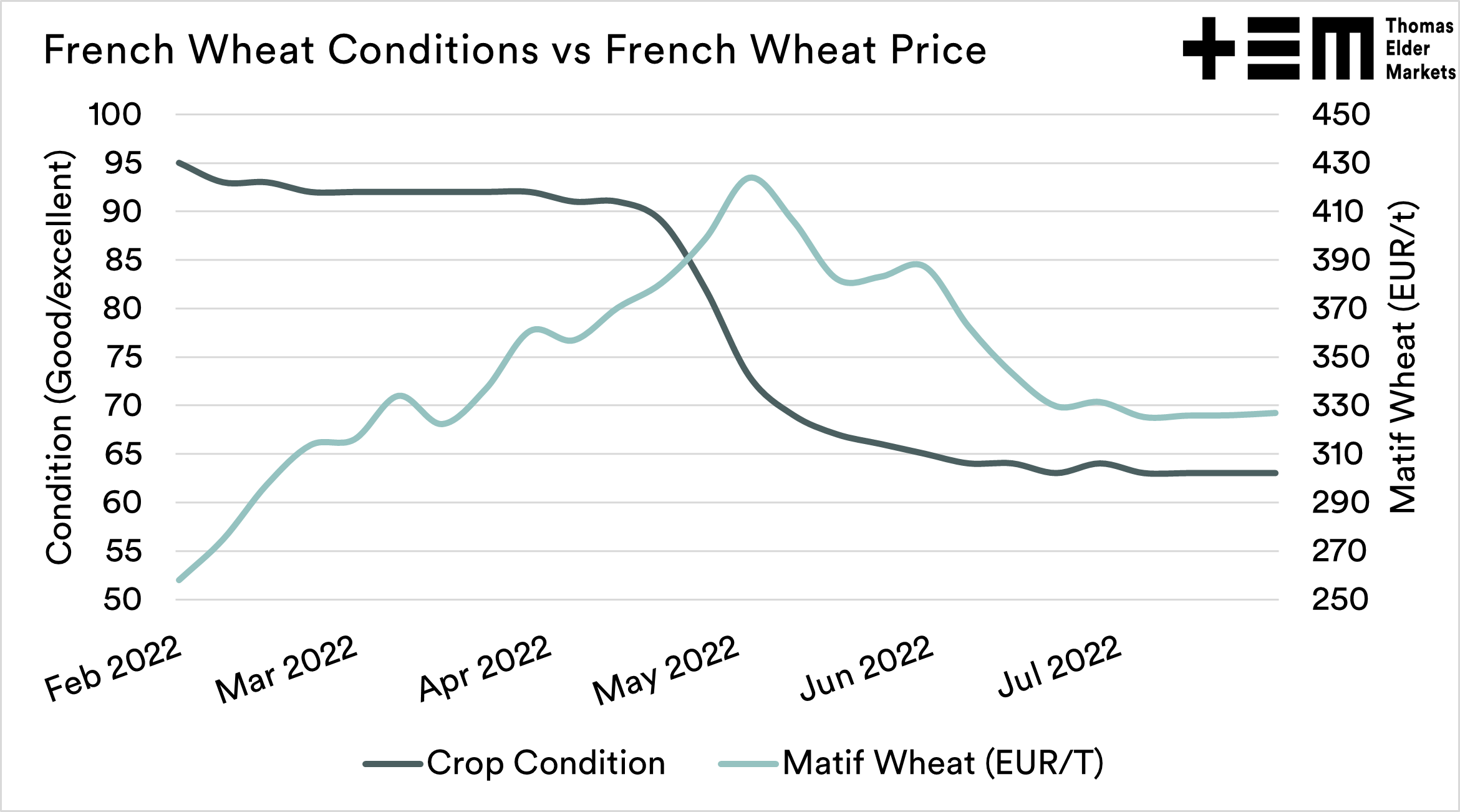 - Wheat prices in France have fallen as conditions deteriorate.