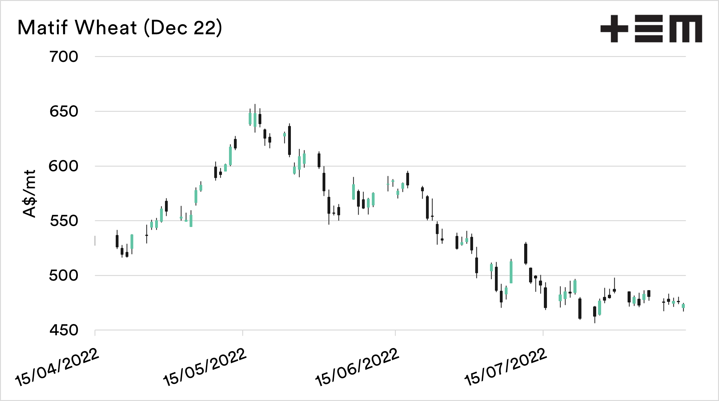 At its peak, Matif wheat was trading at A$648/mt. It has since fallen to A$473