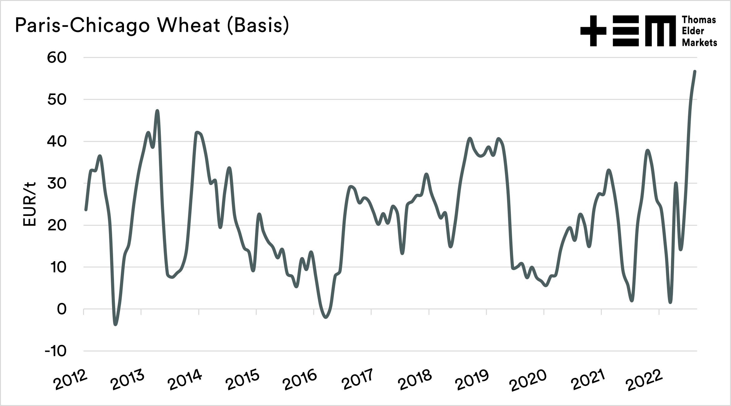 The chart below shows the monthly average basis between Matif and Chicago wheat. August has seen the strongest premium in the past ten years. A sign of local supply coming under pressure.