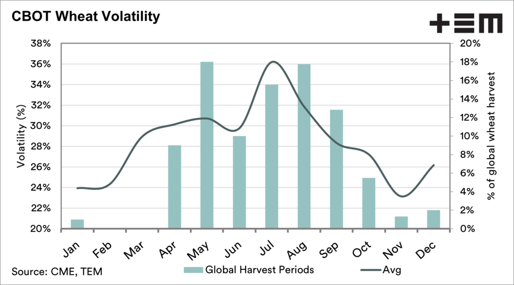 We can see that the higher volatility tends to occur in the middle of the year, when a large proportion of the crop is either harvested, being harvested or ready to start. If there are issues in the northern hemisphere, we start to get fireworks.