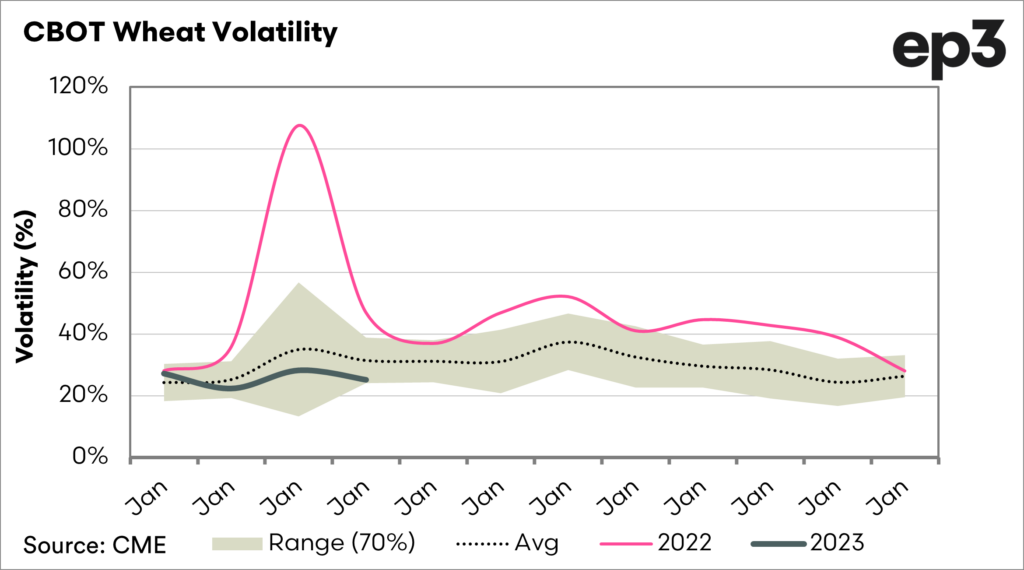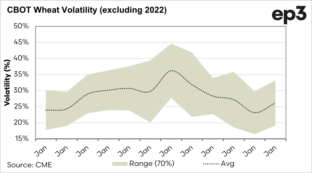 The middle of the year tends to be the most volatile. The chart below shows the seasonality of wheat volatility. This chart excludes last year, as the huge volatility this time last year was caused by the black swan event of the invasion of Ukraine.