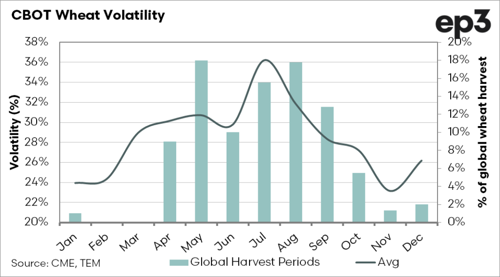 If we use CBOT as an indicator of global wheat markets, the volatility increases towards the middle of the year. The chart above displays the average monthly volatility (excluding 2022), against the world’s wheat harvest percentage.