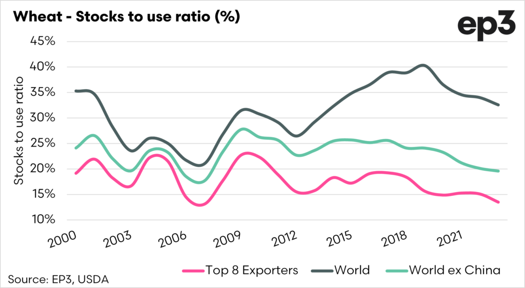 - The global wheat stocks to use ratio (minus China) is the lowest since 2007