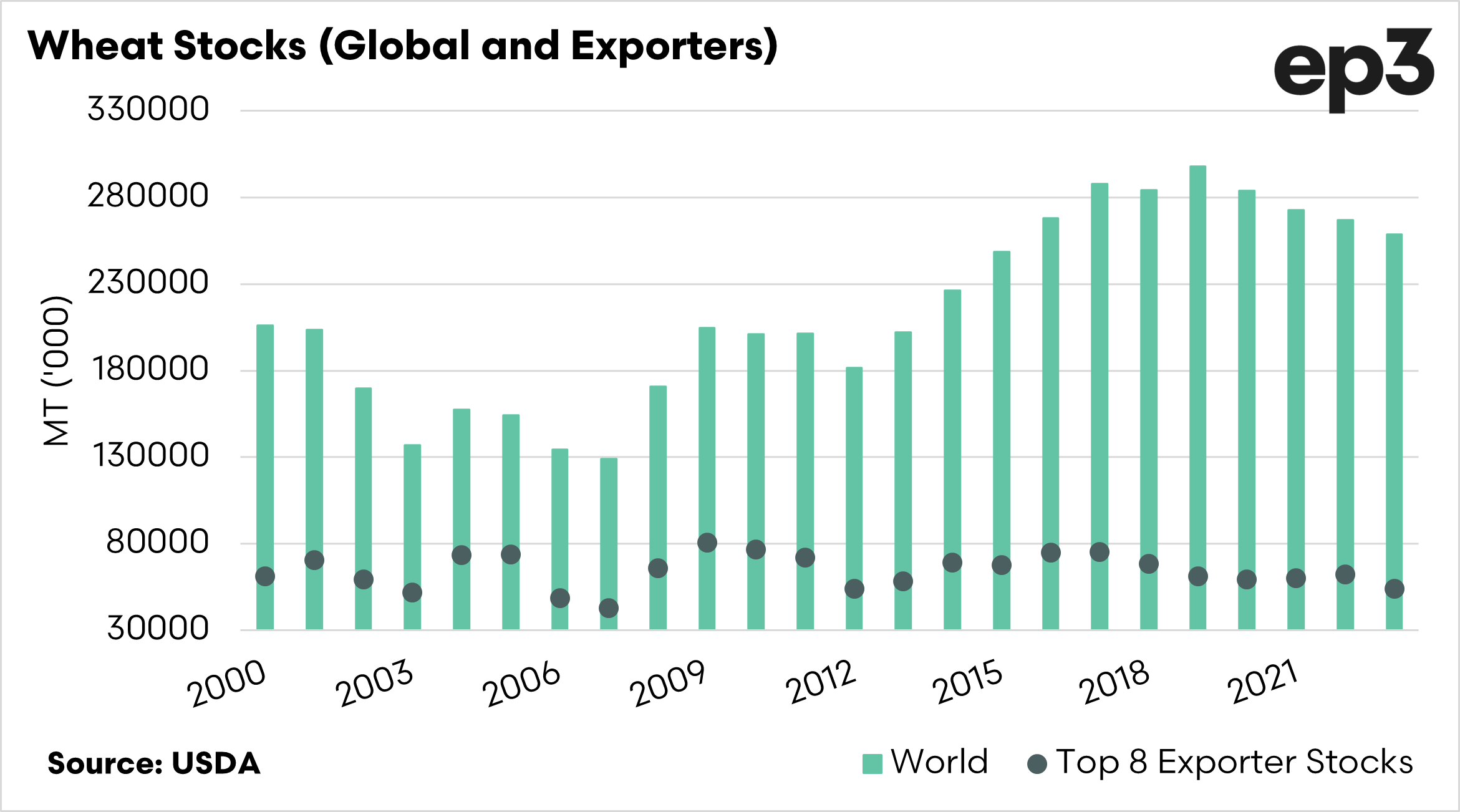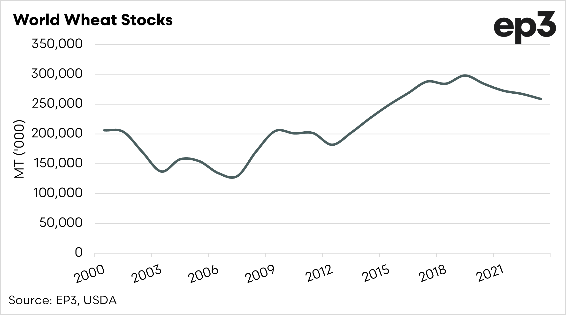 Wheat stocks globally have fallen since 2019 when they hit record levels, but they are still historically quite high.