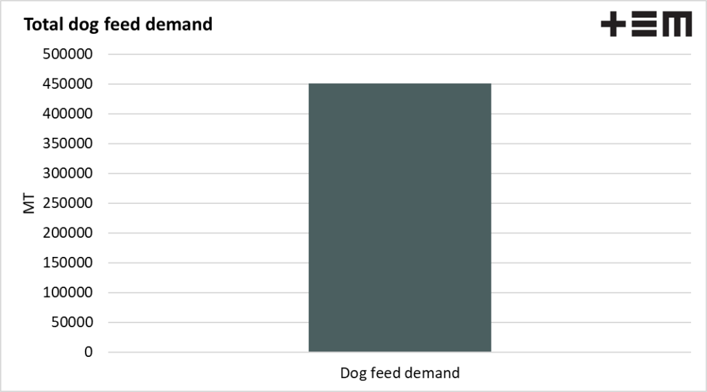 At an average dog size of 22kg, this amounts to 242g of food per day. Across our average population of dogs, this is 451kmt of feed per year. This isn’t a volume that should be sniffed at.
