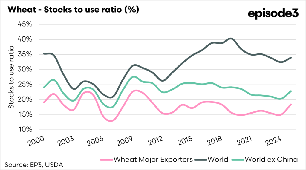 When EP3 examines the stocks-to-use ratio, we look at the world, the world without China and the major wheat exporters. The stocks-to-use ratio has improved significantly this year, indicating a well-supplied world.