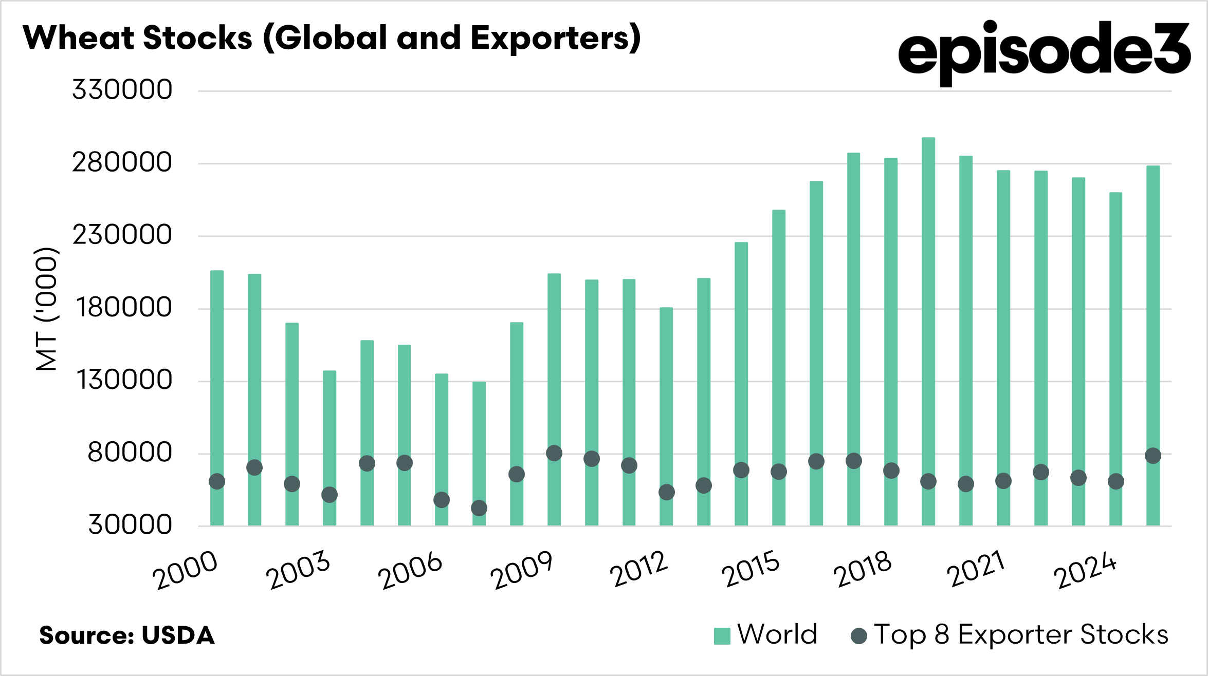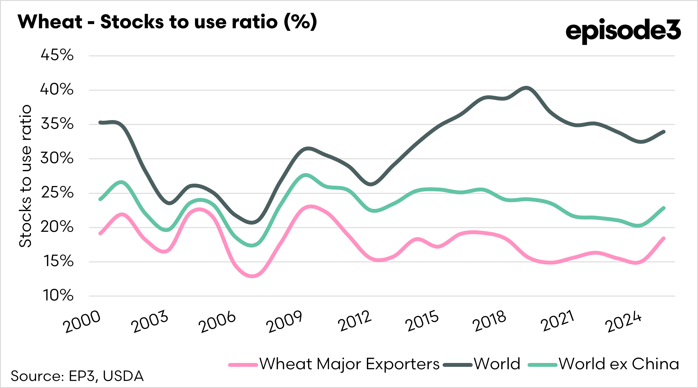 The stocks-to-use ratio measures how much wheat is held in global inventories relative to expected consumption, providing a simple gauge of how tight or comfortable the supply balance is. A lower ratio signals increased vulnerability to price volatility from weather, trade disruptions or geopolitical shocks, while a higher ratio suggests the market has a greater buffer to absorb supply shocks.