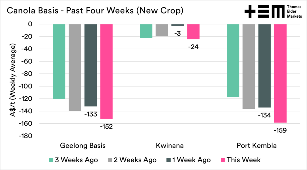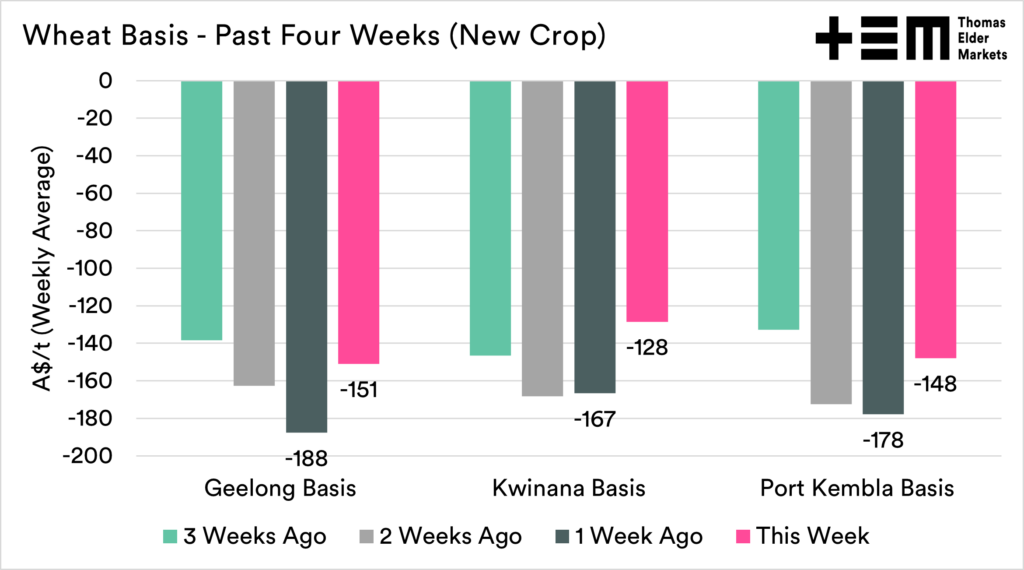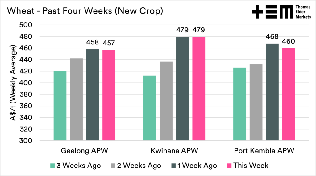 At a local level, new crop wheat was largely pretty stable around the country, holding on at high levels. The CBOT wheat market fell A$22 from the start of the week. Therefore relative to futures, our prices improved.