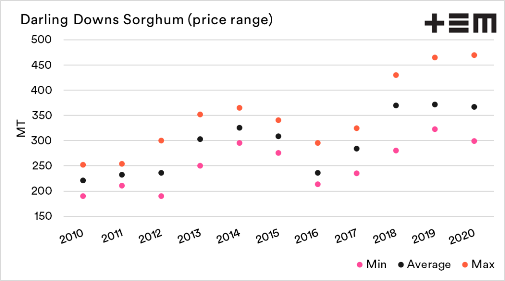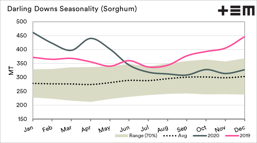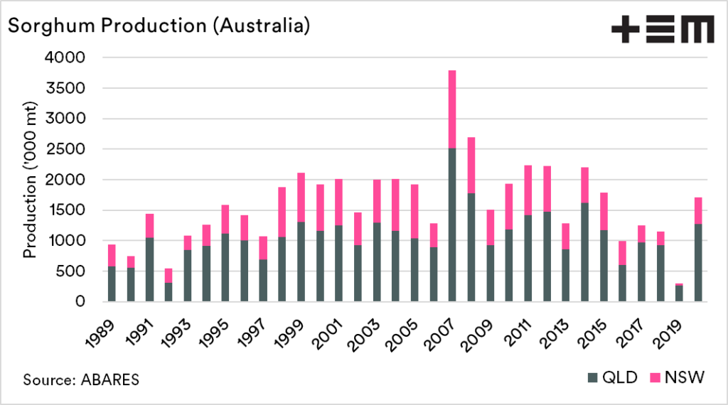 The majority of Australian sorghum is grown in northern New South Wales and southern Queensland. Last year was a shocker in terms of production, with only 296kmt grown, versus forecasts for this year of 1.7mmt. The average for 2010 to 2019 was 1.5mmt.