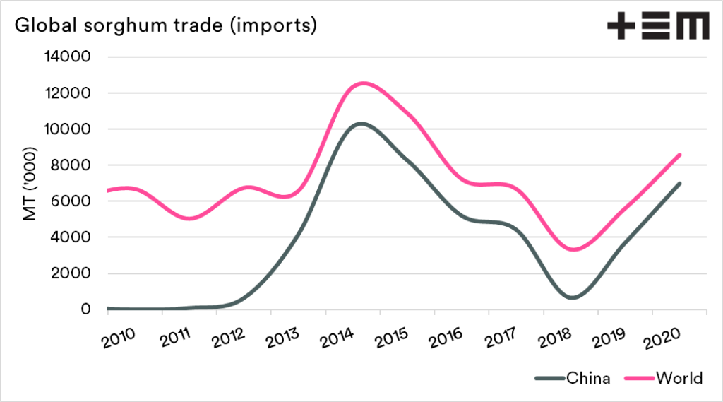 Sorghum has mostly been domestically focused in recent years. This year we are likely looking towards the export market. Regular readers will be aware that Chinese imports of grains are on the up (see here).