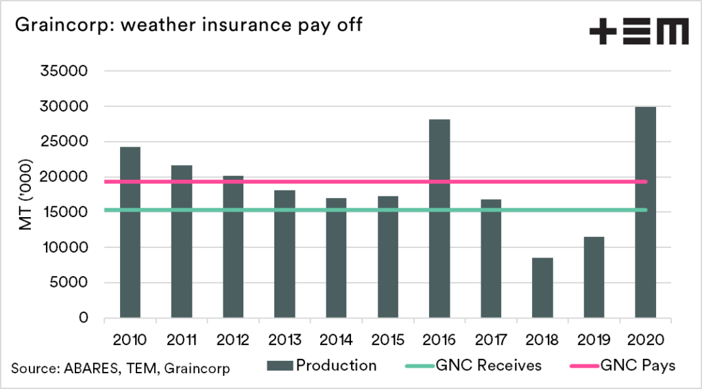 In a bountiful year, where winter crop production exceeds 19.3mmt, GrainCorp pays the insurer A$15, up to a cap of A$70m. It is reported that the annual fee for this service is around A$10m.