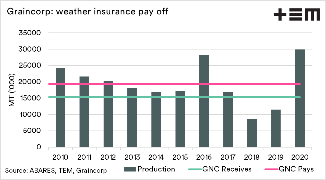 It is important to note that during the years of surplus production, GrainCorp receivals will generally be higher, barring competing storage networks or increasing on-farm storage. The likelihood is that income will be substantially higher in the years that they have to pay the insurer.