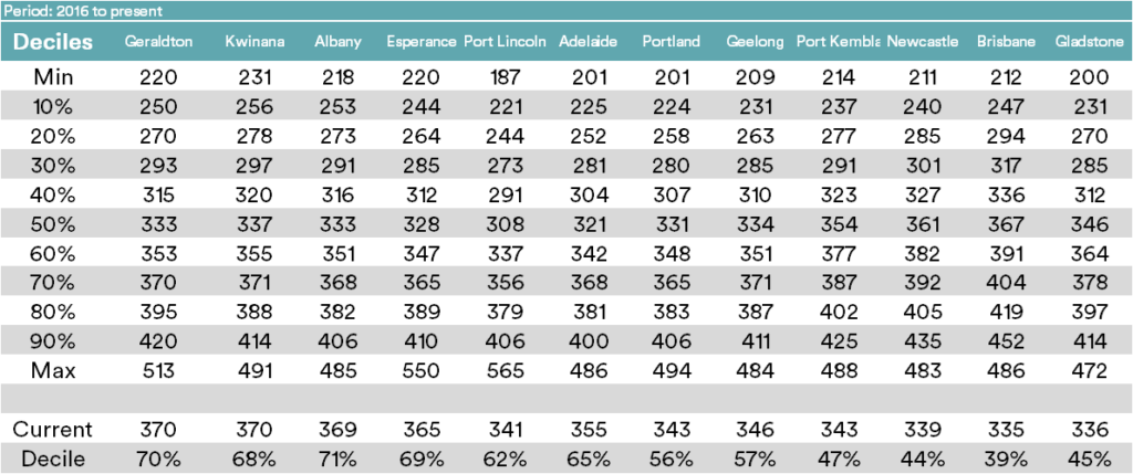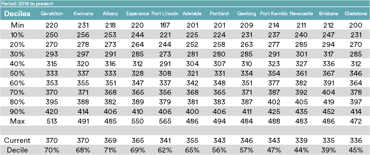 There is a huge range if we look at the difference between the 90th decile and max in wheat. The 90th decile is at A$414, whilst the 100th decile is at A$491. It is the extremes at present that are reducing the efficacy of deciles.