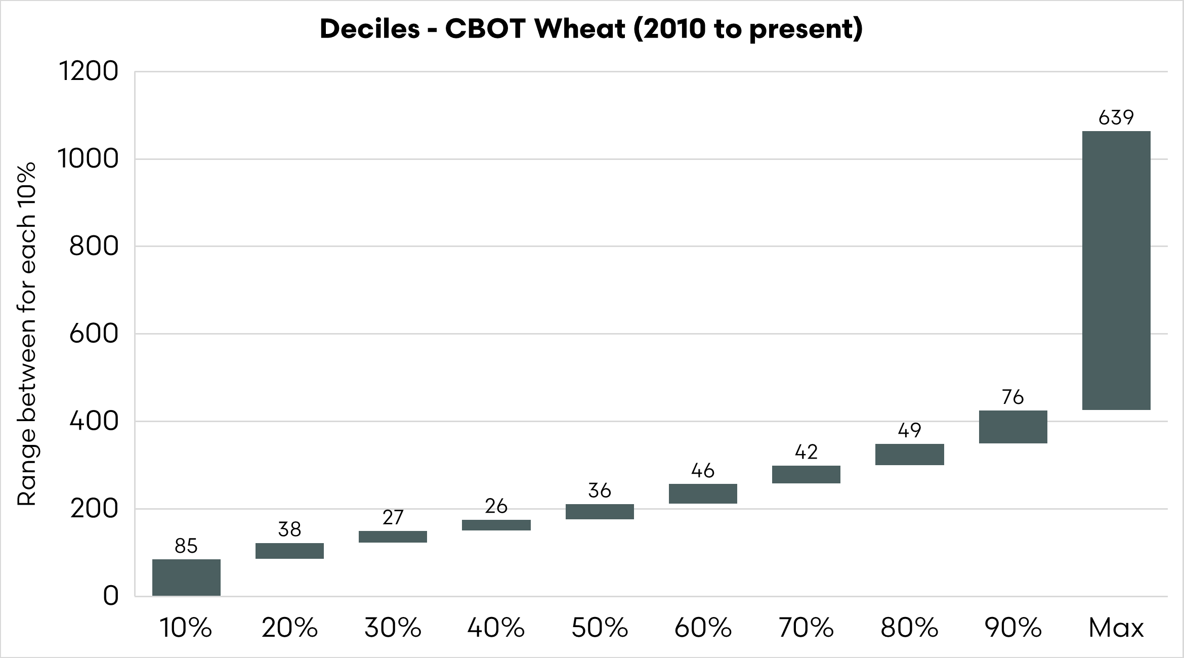 The range between the 90th percentile and the maximum price for wheat is often significantly larger than the other deciles due to the nature of extreme price events in commodity markets. While most price movements occur within relatively stable and narrow bands, the top end of the market distribution captures rare and volatile events. These include major supply shocks like droughts, war, export restrictions, or financial market upheaval, which can cause prices to surge well beyond normal trading levels.