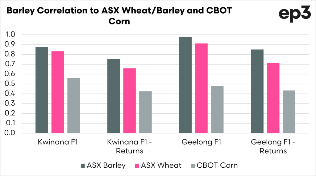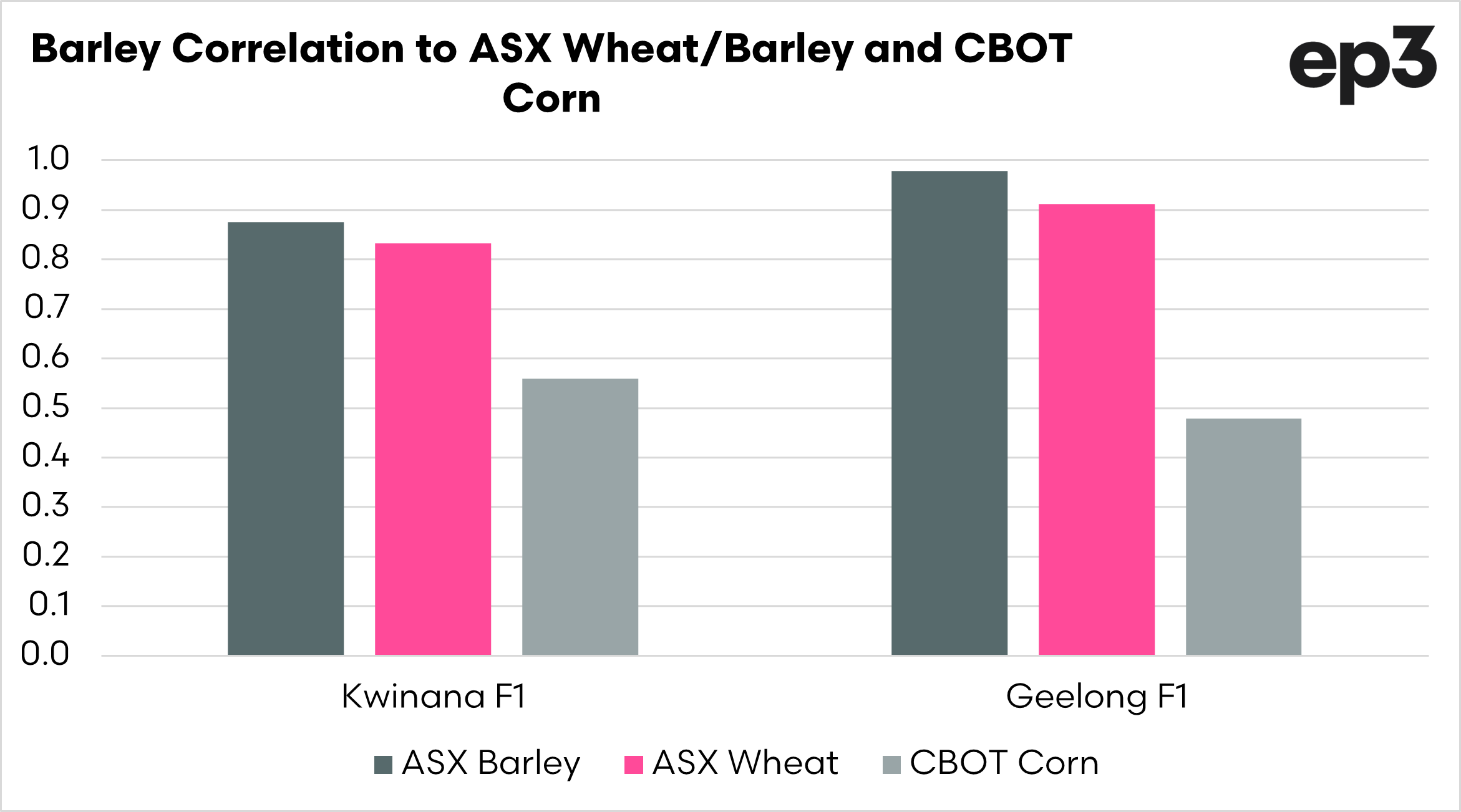 - Australian F1 barley has a strong correlation with the ASX wheat contract, enough to generally make it a reasonable tool for hedging barley, with lower liquidity risk.