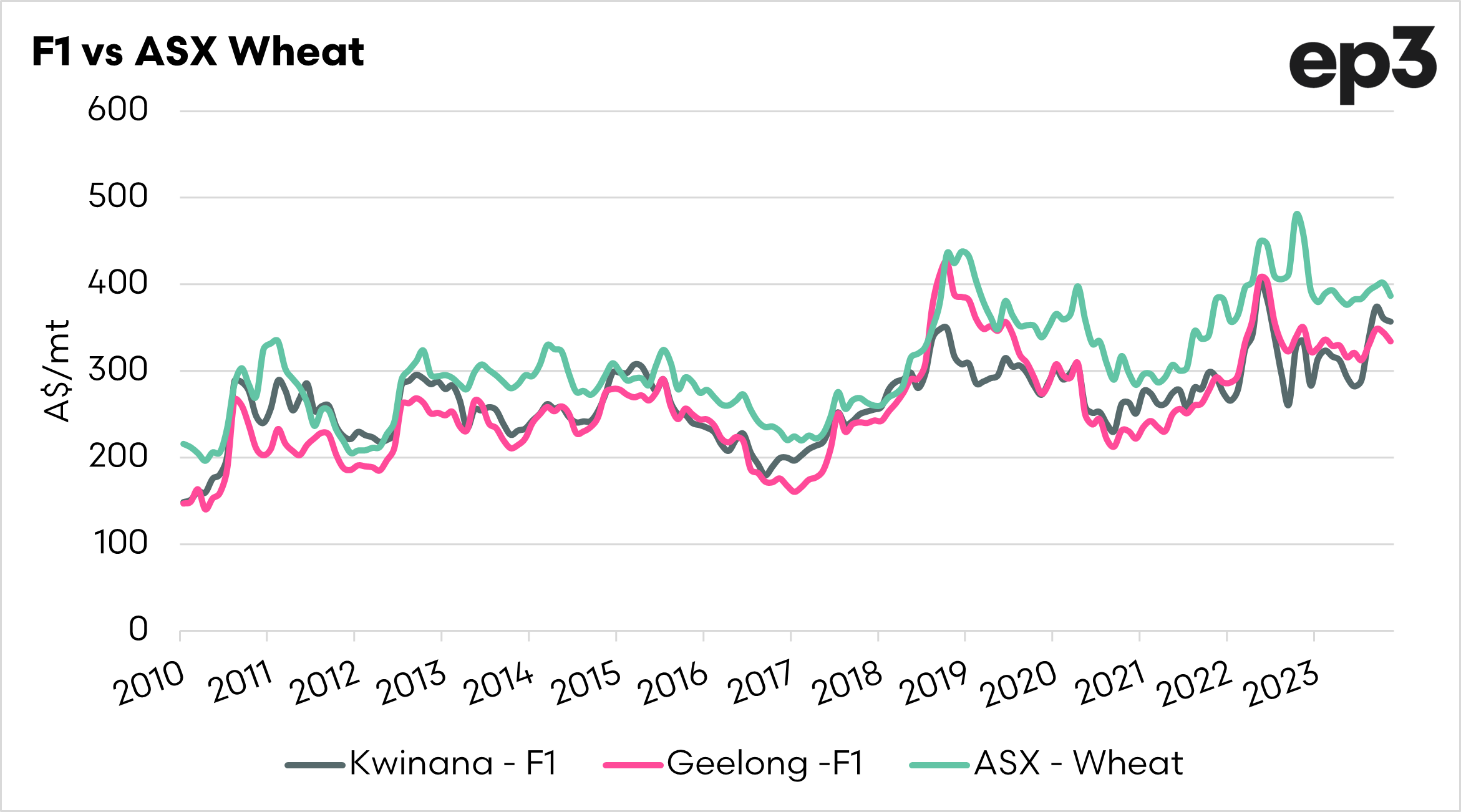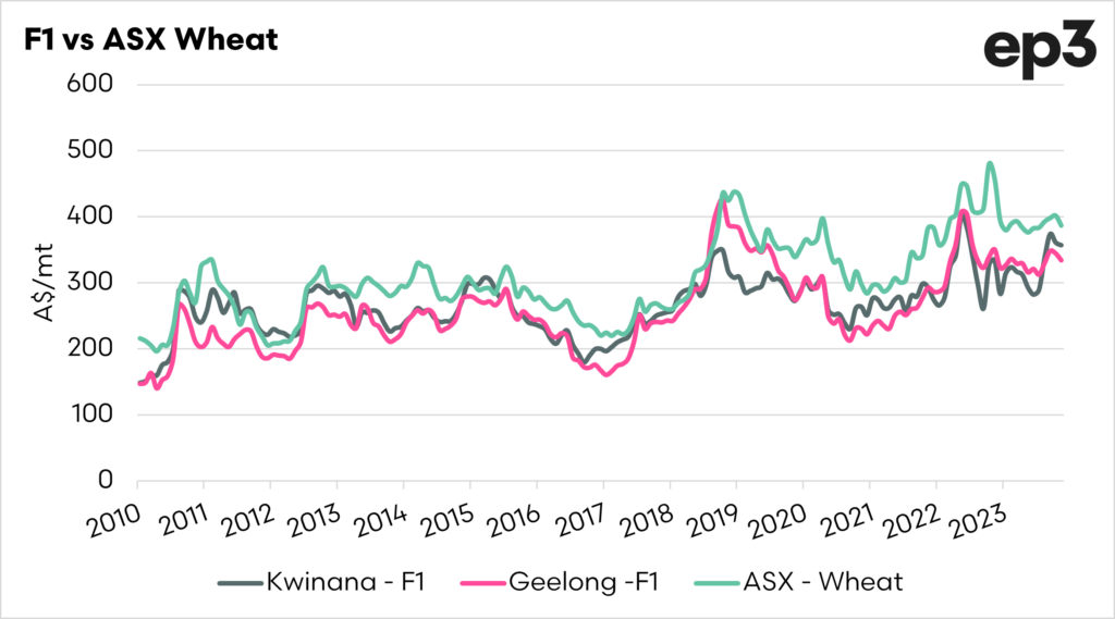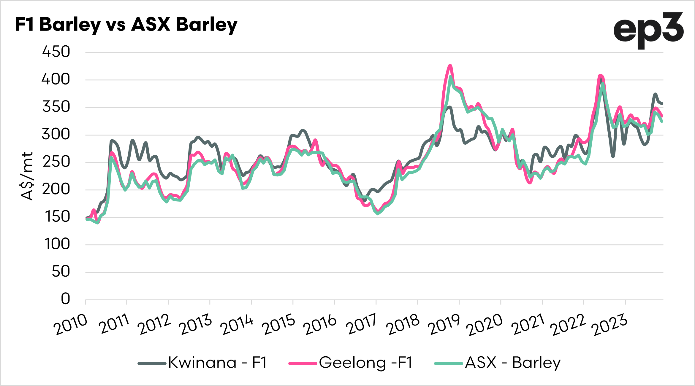 ASX wheat and barley both hold close relationships with physical F1 pricing, especially east coast pricing points.