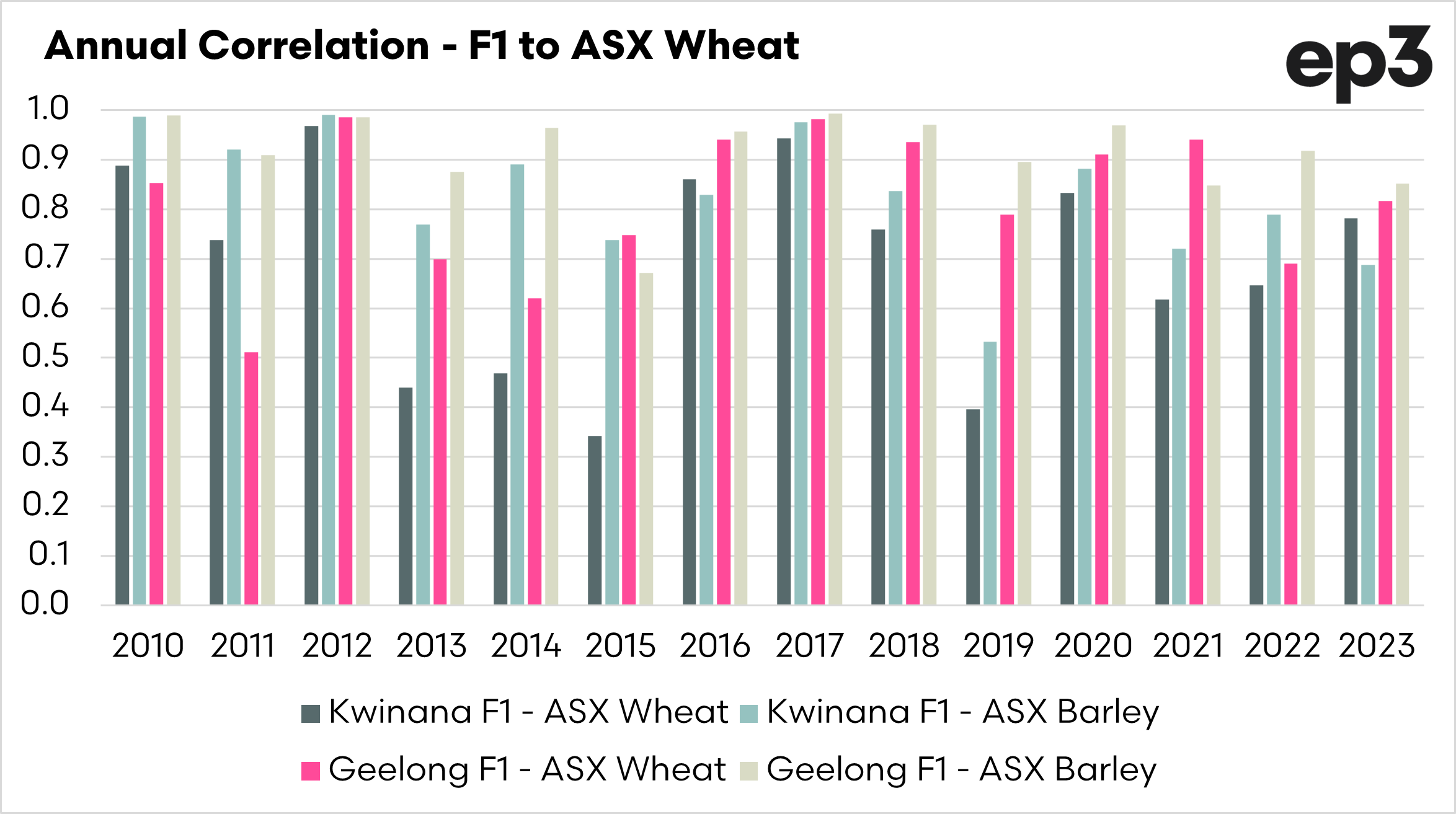 - The ASX barley contract has a much more consistent correlation than the wheat contract with WA F1 pricing.
