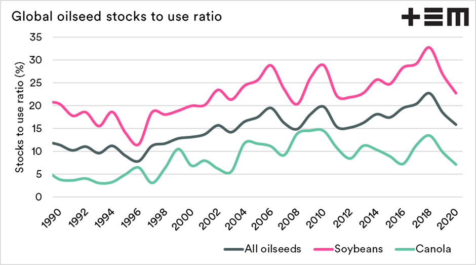 - The global oilseed STU is at 22%, which is the lowest since 2013. The global canola STU is at 7%, the lowest since 2016.